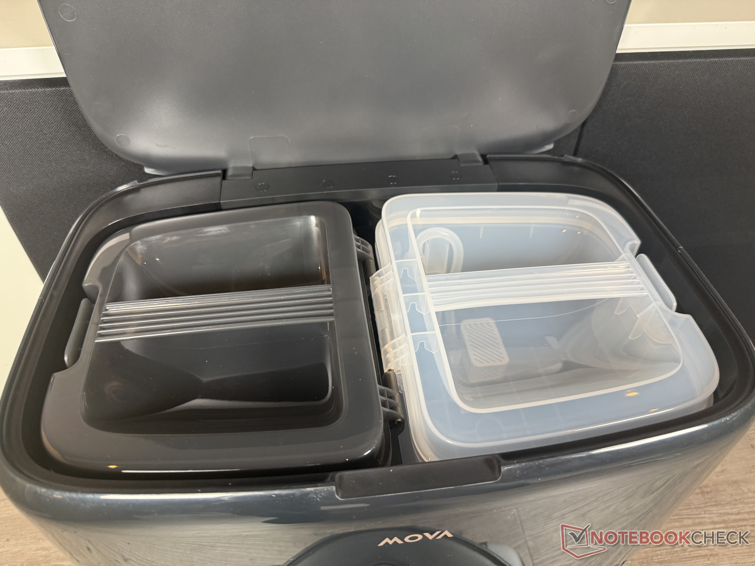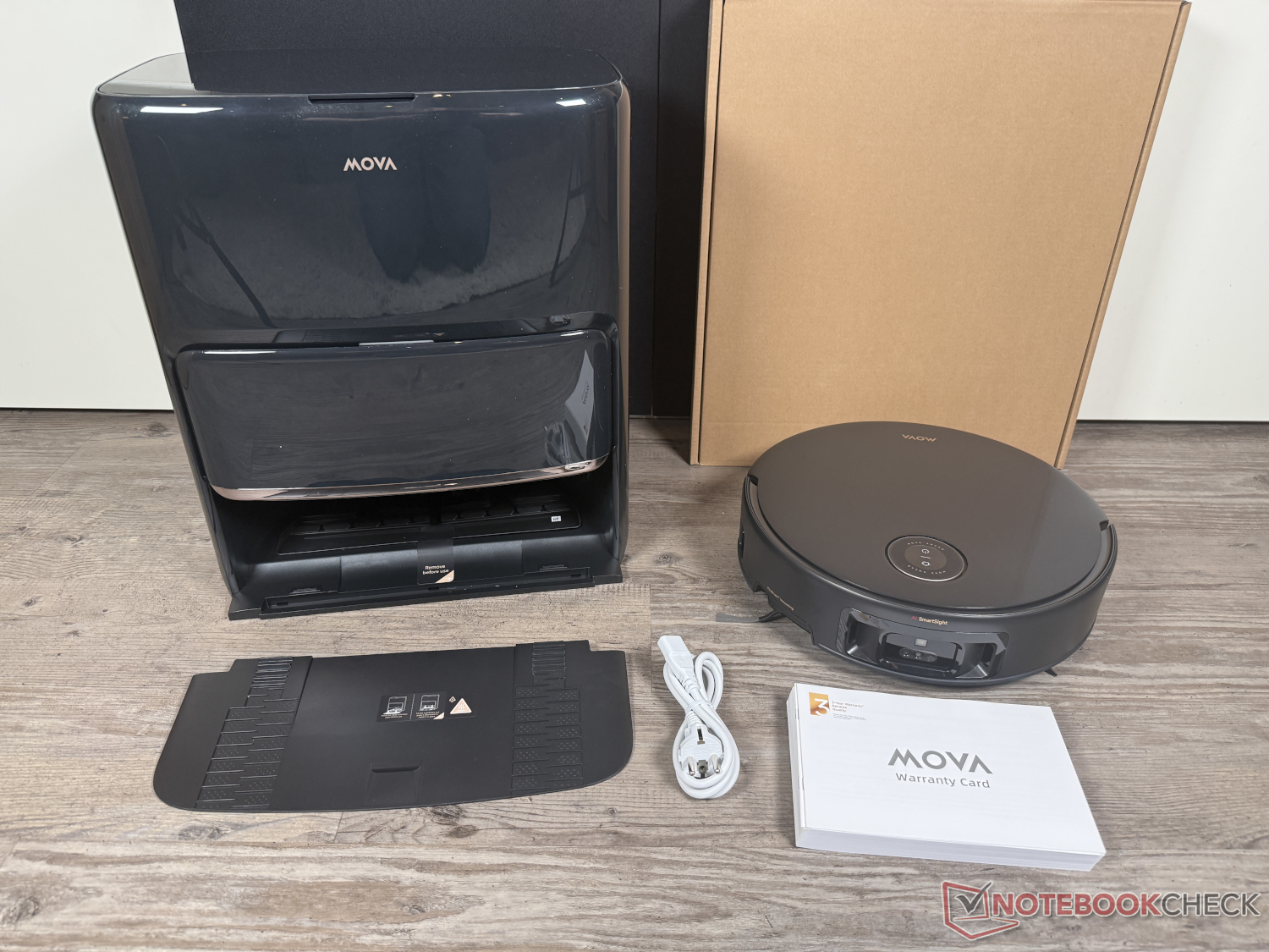 El rodillo Mova Z60 Ultra en su versión completa también incluye un amplio volumen de suministro. Además del robot y la estación base, viene con cuatro bolsas de polvo y limpiadores de rodillo, dos cepillos principales, tres cepillos laterales, cuatro filtros de polvo (cada uno se instala una vez, resto de recambio), así como 1 l de solución limpiadora y 200 ml de eliminador de olores de mascotas.