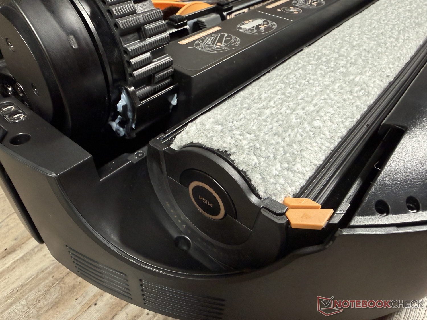 Lo que también es idéntico es que ambos robots aspiradores utilizan un rodillo mopa ancho para fregar. La tecnología se denomina Mova HydroForce mopping y enjuaga constantemente el rodillo mopa, que previamente se ha liberado de agua sucia, con chorros de agua fresca procedentes de doce boquillas. Con 4.100 Pa, la presión de contacto es ligeramente inferior que con Dreame. Sin embargo, el escudo protector que cubre el rodillo de la mopa cuando se limpian alfombras también está a bordo aquí.