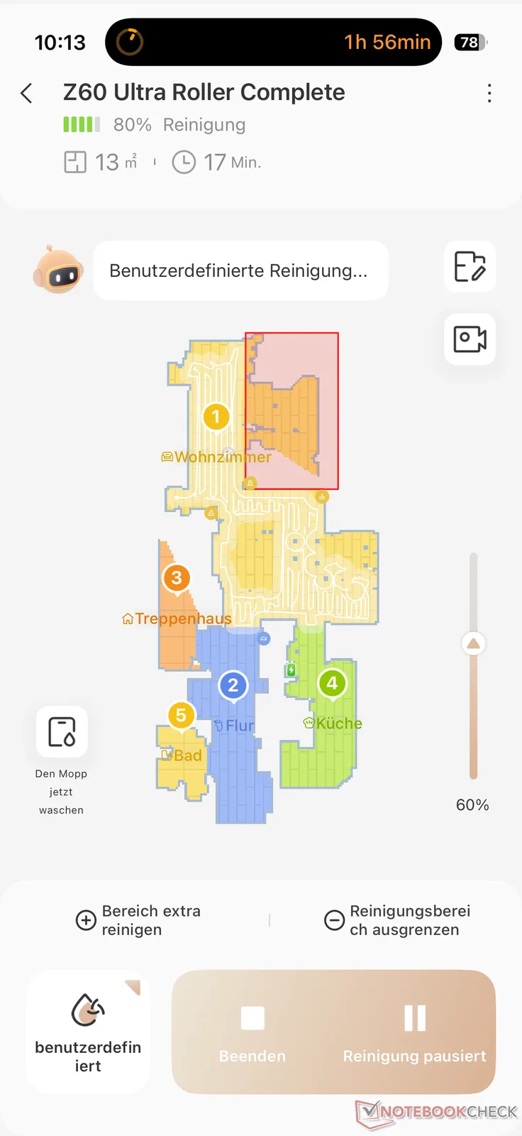 La Mova Z60 Ultra Roller Complete completó nuestra rutina habitual de limpieza de 50 metros cuadrados con suelos predominantemente lisos y alguna alfombra, que todo robot aspirador de prueba tiene que completar con los ajustes estándar, con un 34 por ciento de capacidad restante en la batería de 6.400 mAh. Esto significa que el modelo con rodillo de mopa consume bastante energía y sólo puede limpiar unos buenos 60 metros cuadrados por carga de batería con estos ajustes.