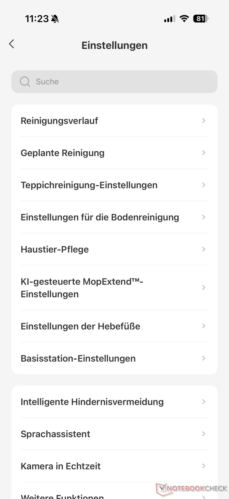 En el menú dispone de varias opciones para configurar el comportamiento del robot aspirador y de la estación. Además de su propio asistente de voz, que también habla alemán, las limpiezas programadas y la función de vídeo en directo completan las características de la exitosa aplicación Mova. Lo único que echamos en falta aquí es la compatibilidad con Matter.