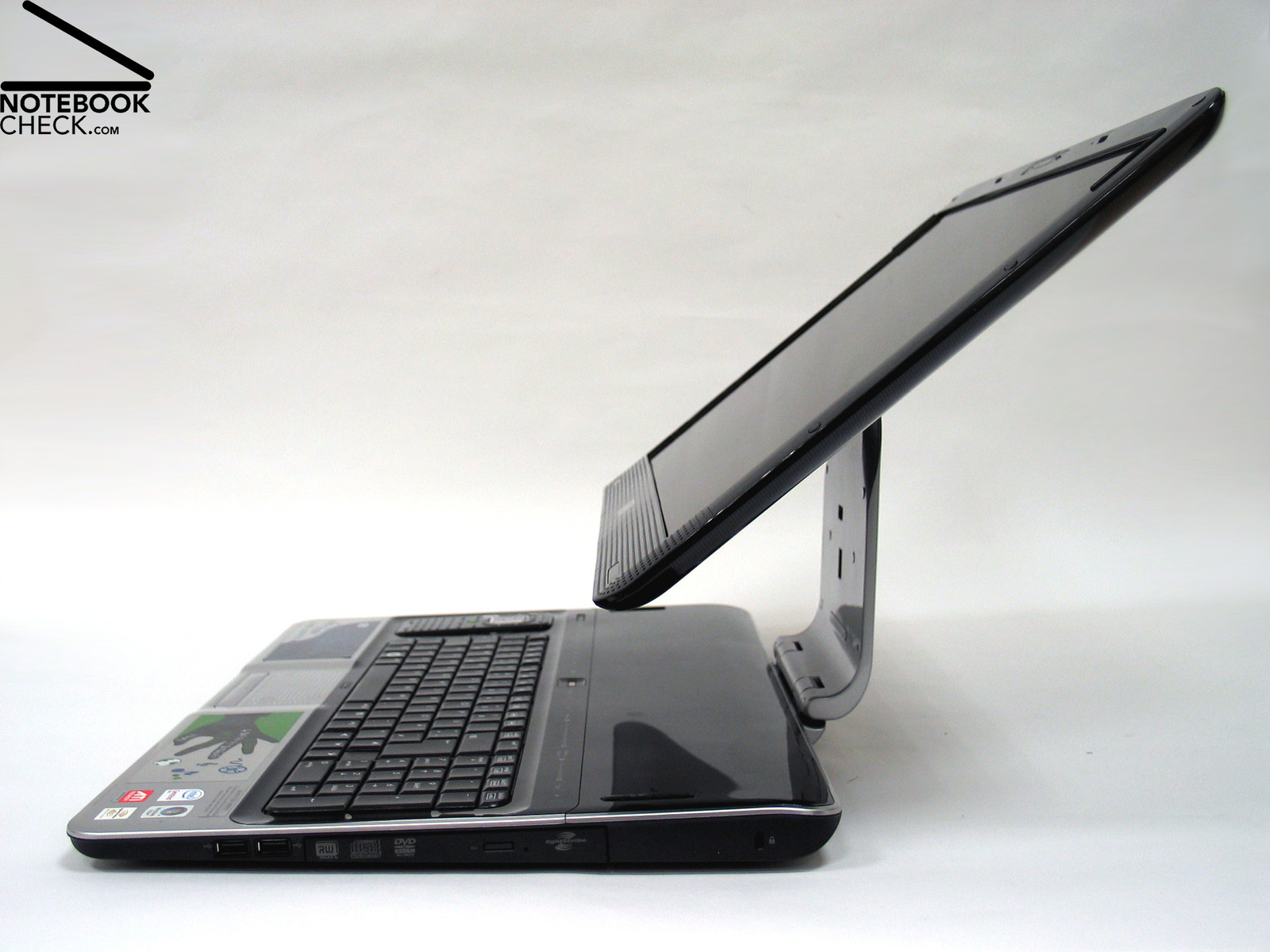 Un excepcional detalle del HDX9130EG es el sistema de cerrado de la pantalla, aunque este necesita algún tiempo para adaptarse. Una opción de esta solución especial es de doblar la pantalla hacia atrás, sin incrementar la distancia a los ojos. El cierre de y apertura de la pantalla sin embargo no parece muy intuitiva, ya que las bisagras son bastantes duras y muy cercas de cada una. Esto causa una susceptibilidad a la deformación, que ciertamente no tiene una influencia positiva en la durabilidad. Además, este necesita alguna practica para correctamente cerrar la pantalla. Las dos cubiertas de goma, que son supuestamente para proteger el chasis de rayones, no son lo suficientemente grandes en nuestra opinión. Esto rápidamente resulta en rayas y daños en la sensitiva unidad base.