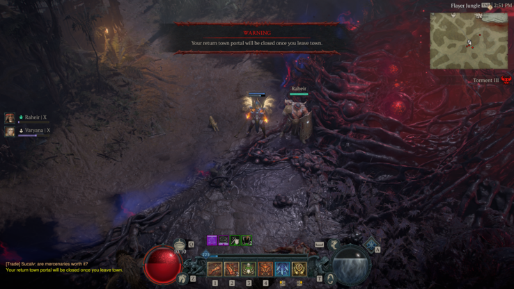 Los mercenarios, por otro lado, no son ni de lejos tan útiles. A diferencia de Diablo 2, donde podías equipar a tu mercenario con equipo sobrante de tu build, los mercenarios de Diablo 4 son unidades de apoyo que ocasionalmente lanzan una o dos habilidades. Puedes tener un mercenario activo a tu lado y reclutar a un segundo como refuerzo. El personaje de refuerzo puede lanzar una habilidad en función de unas condiciones predeterminadas. Sólo hay cuatro mercenarios entre los que elegir, todos los cuales deben desbloquearse mediante misiones independientes. Cada mercenario viene con una saludable mezcla de habilidades/pasivos. Es una mezcla saludable de defensa, control de multitudes y agresión, y disfruté bastante mezclando y combinando distintas combinaciones. Más adelante en el juego, se puede hacer trueque con los mercenarios en un núcleo central llamado "La Guarida".