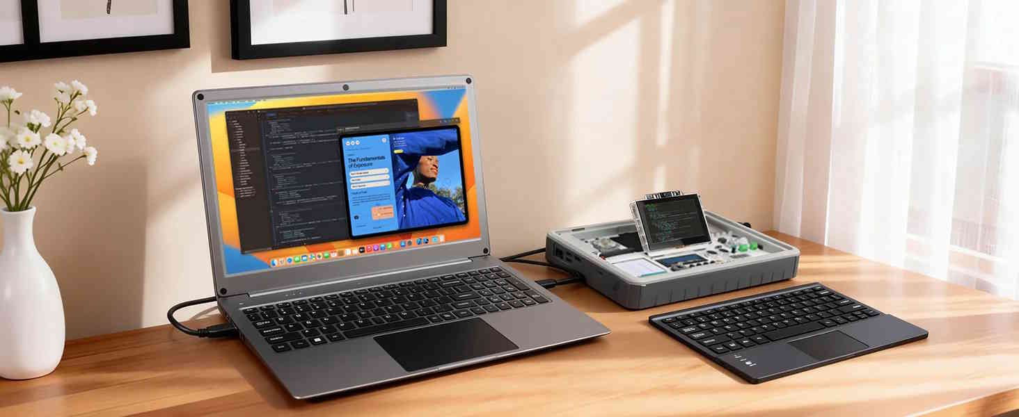 Elecrow ofrece sistemas que pueden describirse simplemente como ordenadores portátiles sin procesador dedicado. El CrowView Note 15.6 es uno de estos modelos, que se conecta a un smartphone compatible o a un mini PC. Se puede utilizar, por ejemplo, mientras se viaja, al responder correos electrónicos o manejar tareas más sencillas sin usar programas dedicados de Windows o macOS, o cuando los usuarios no quieren renunciar a una experiencia (limitada) con un portátil.