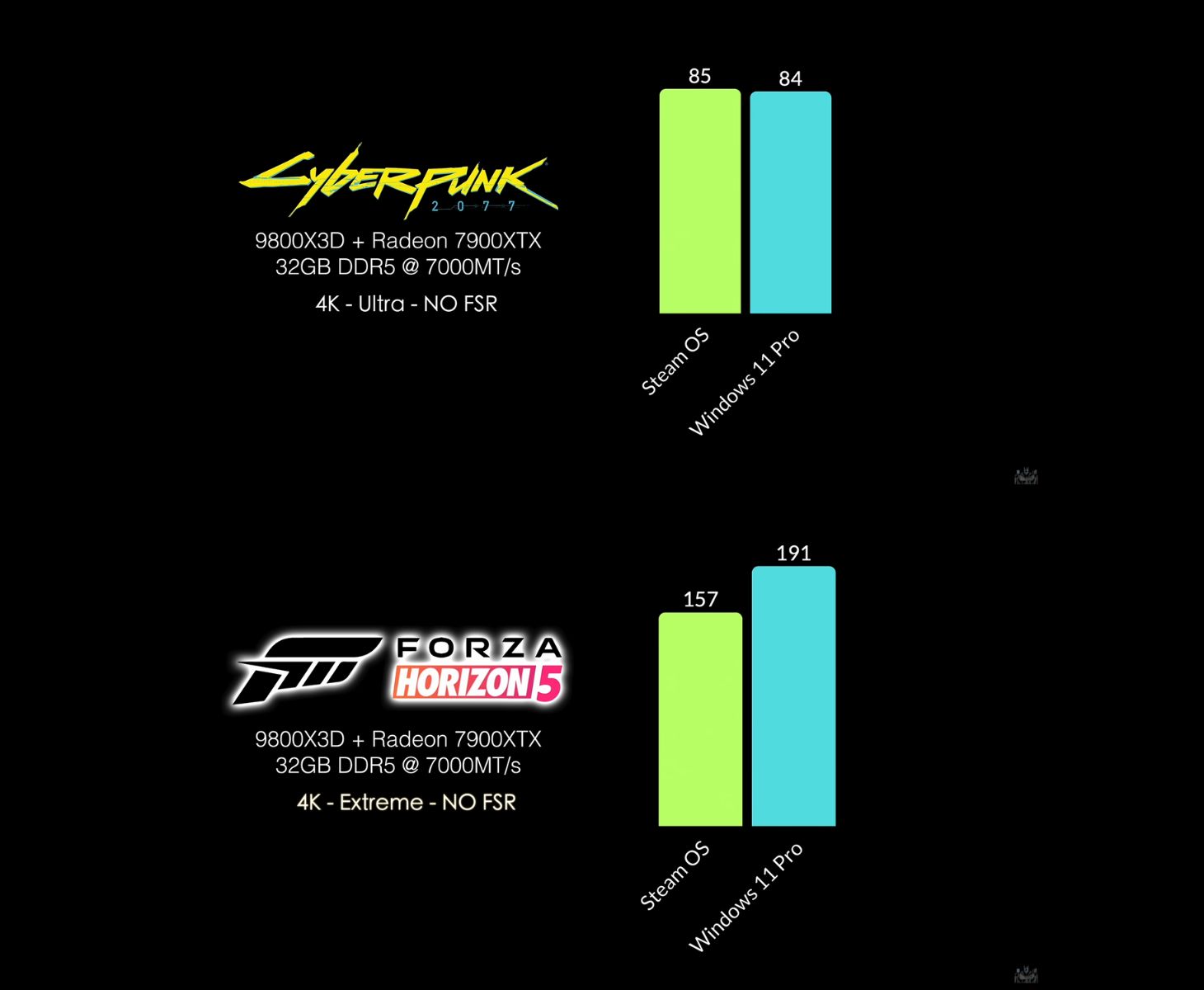 Borderlands 4 mostró una pequeña ventaja para Windows 11, con una media de 74 FPS frente a los 69 FPS de SteamOS en 4K Ultra con la calidad FSR activada. Forza Horizon 5 mostró una de las mayores diferencias, con una media de 157 FPS de SteamOS en ajustes 4K Extremo sin FSR, mientras que Windows 11 alcanzó los 191 FPS. ETA Prime sugirió que la diferencia puede estar influida por los estrechos vínculos del título con el ecosistema de Microsoft.