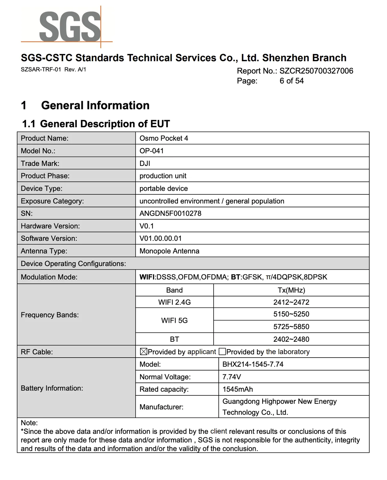 También vuelve la compatibilidad con Bluetooth Low Energy. Sin embargo, queda por ver si el Osmo Pocket 4 avanzará más allá del estándar BLE 5.2 que DJI proporcionó a su predecesor. En cualquier caso, la FCC indica que el Osmo Pocket 4 se lanzará con una actualización significativa de la batería. Hasta ahora, la FCC sólo ha revelado una batería de 1.545 mAh de capacidad nominal.