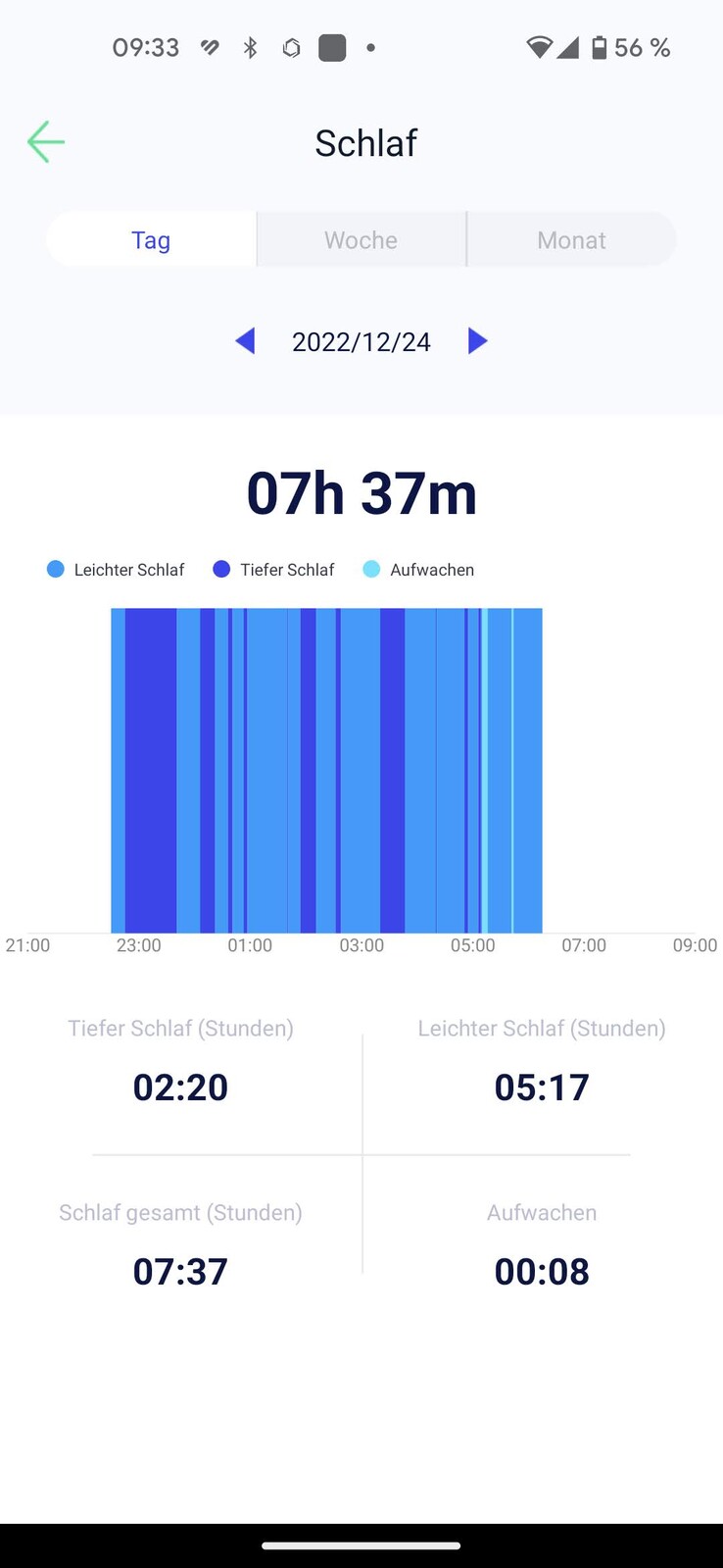 El seguimiento del sueño del DT8 Ultra es muy rudimentario. El software muestra el tiempo total de sueño, así como los valores de las fases de sueño ligero, sueño profundo y vigilia. Sin embargo, los valores registrados deben tomarse con precaución. A veces, el reloj mostró tiempos mucho más cortos en la prueba, por ejemplo, sólo cuatro horas de sueño, aunque el probador durmió casi ocho horas. El DT8 Ultra no reconoce en absoluto las siestas, y también se echa en falta un despertador inteligente.