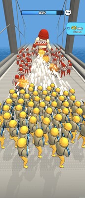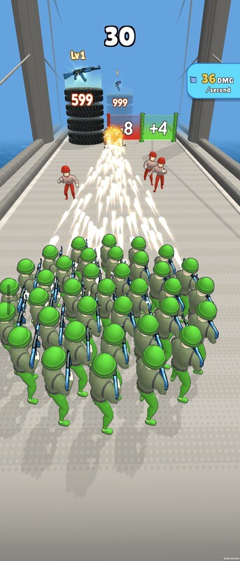 El desarrollador ha convertido el concepto básico de disparar a números en un shooter de supervivencia sobre raíles en un pequeño paquete satisfactorio que puede resultar bastante adictivo si, como a mí, le gusta ver cómo suben los números y hacer que las cosas exploten con frecuencia de forma espectacular en su pantalla. El modo de juego es sencillo: dispare a los campos adecuados en el momento oportuno para hacer que su número y potencia de fuego suban, y haga lo mismo con las distintas armas esparcidas por el campo, mientras intenta despejar las oleadas de enemigos que se lanzan contra su escuadrón, o que chocan contra los neumáticos o los campos negativos. Como era de esperar, los niveles culminan en una lucha contra un jefe, contra un enemigo más grande y más duro.