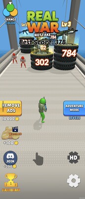 Real War cuenta con dos modos de juego: un modo sin fin que registra su puntuación más alta (la mía es 378), y un modo aventura en el que deberá completar niveles y ganar monedas. Las monedas pueden utilizarse para eliminar anuncios, una hazaña que puede llevar algún tiempo completar, ya que al superar un nivel se ganan 10 monedas, y eliminar anuncios cuesta 10.000. Hay otras formas de ganar monedas, como unirse al Discord del desarrollador a través de una opción en la pantalla de menú del juego, que recompensa con 200 monedas, o ver anuncios por 100 monedas.