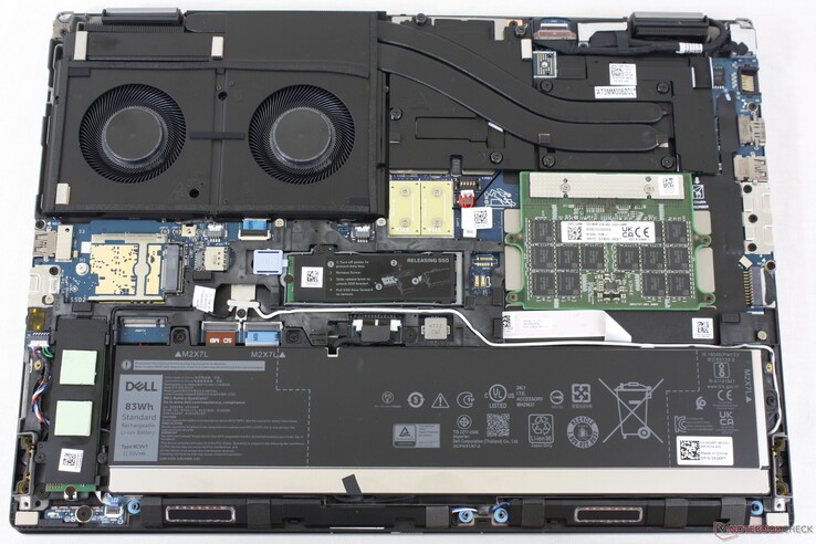 El panel inferior está asegurado por seis tornillos Philips para facilitar el mantenimiento. Las partes internas son similares a las del más delgado Precision 7670, salvo por las diferencias en la capacidad de la batería, el número de bahías de almacenamiento disponibles y la presencia de un pequeño disipador de calor.
