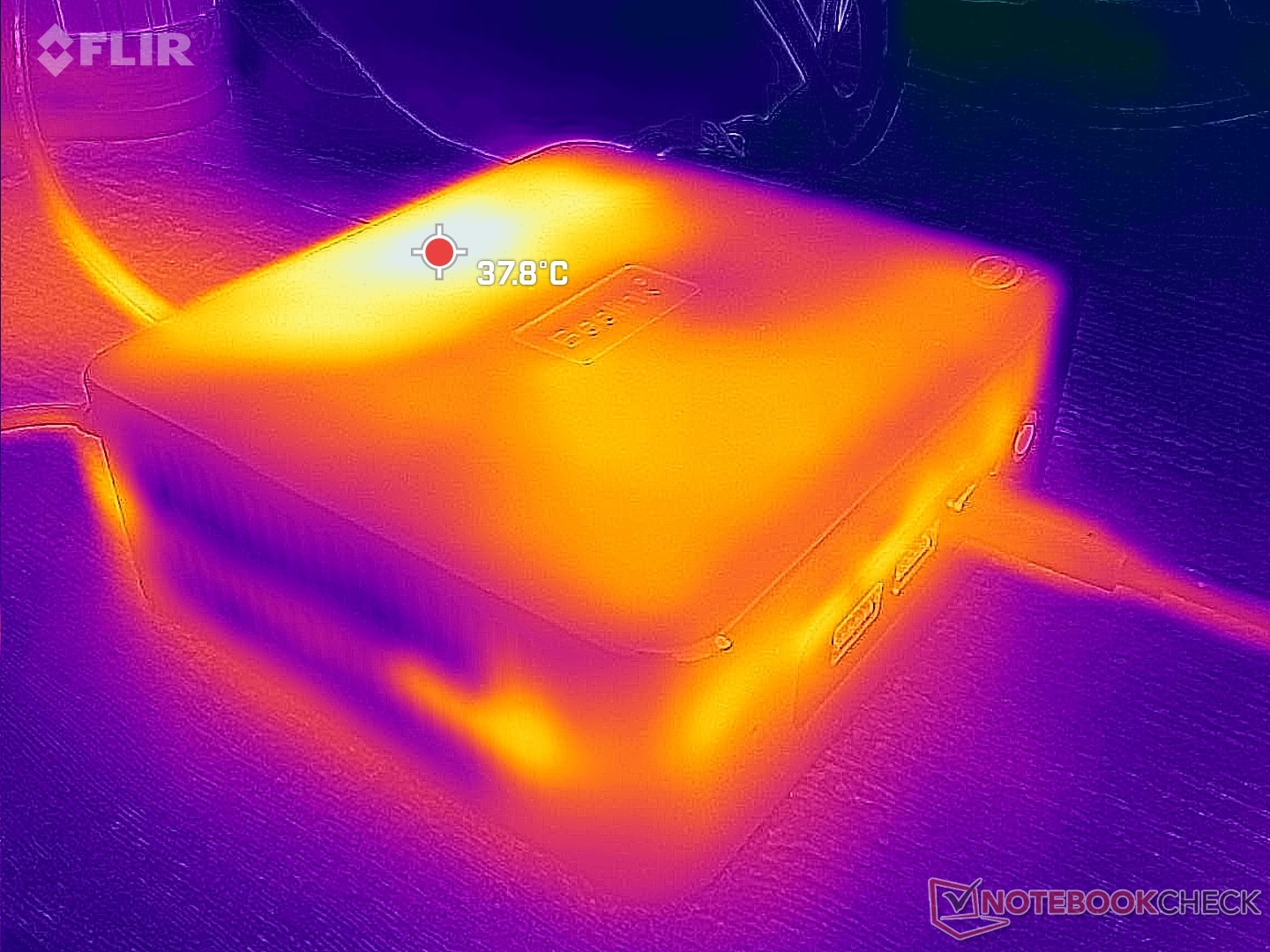 Las temperaturas de la superficie son cálidas incluso cuando está en reposo en el escritorio ya que el ventilador es muy letárgico. La parte superior de la unidad puede alcanzar 32 C cuando no se ejecuta ninguna aplicación o hasta 38 C cuando se ejecutan aplicaciones estresantes durante largos períodos. Los puntos calientes están en la parte trasera del chasis, cerca de las rejillas de ventilación traseras.