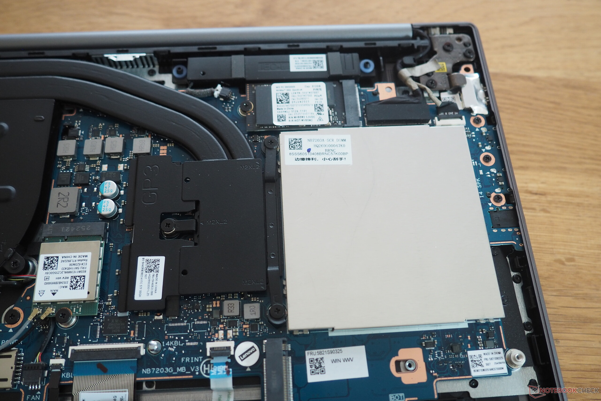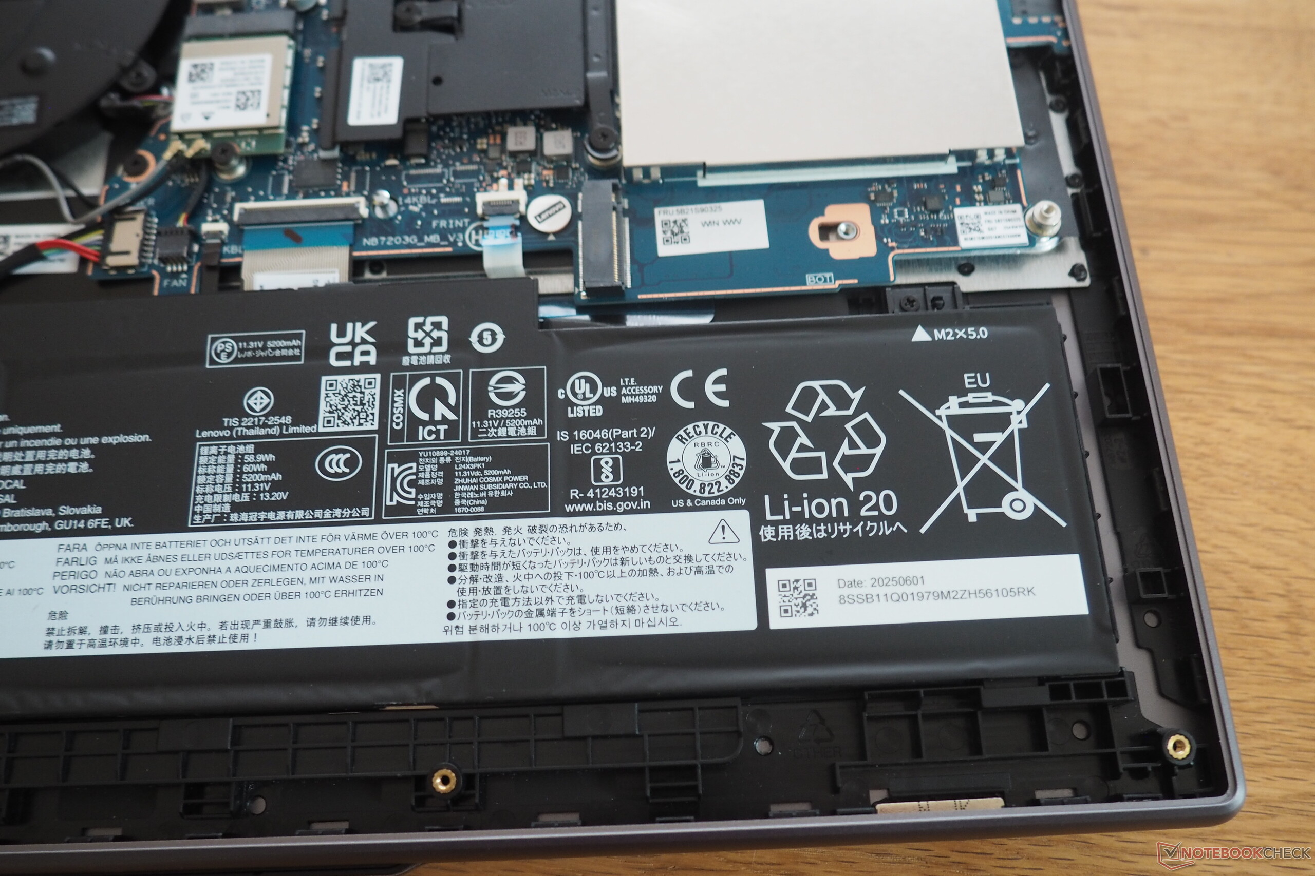 En el lado izquierdo, encontrará dos puertos USB-C 3.1 Gen 2 con soporte DisplayPort 1.4 y PowerDelivery, junto con una salida HDMI y una toma de audio combinada. El lado derecho alberga un lector de tarjetas microSD razonablemente rápido y dos puertos USB-A 3.0 convencionales. No se incluye un puerto Ethernet, pero el portátil sí incorpora un módulo Wi-Fi 7 muy rápido. La cámara web, que incluye un obturador de privacidad, ofrece sólo 0,9 MP de resolución, pero aun así produce una imagen más nítida que muchos modelos de la competencia. La cubierta inferior es fácil de retirar tras aflojar seis tornillos Torx. En el interior, encontrará dos ranuras SO-DIMM ocupadas, así como dos ranuras M.2. La ranura 2280 está libre, mientras que la SSD instalada se sitúa en la ranura 2242, más pequeña.
