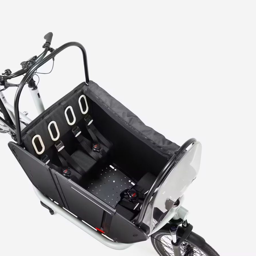 Según Decathlon, los niños pueden acceder fácilmente al portaequipajes de la Btwin F900E, con asientos para tres pasajeros. Hay una cubierta protectora contra la lluvia para el portaequipajes y un parabrisas, y la bicicleta de carga soporta una carga máxima de 184 kg (~406 lbs). Los faros delanteros están instalados en el bajo cuadro escalonado, y hay tiras reflectantes en los neumáticos para ayudarle a ser visible por la noche. Otro accesorio es una pantalla en color en la potencia de la e-bike, que muestra información como el modo de asistencia y el nivel de batería restante. Además, la bicicleta eléctrica está equipada con una unidad 4G/GPS, aunque el seguimiento GPS requiere una suscripción.