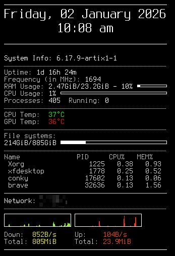 La personalización es un toma y daca y variará en función del entorno de escritorio o gestor de ventanas que elija. Yo utilizo XFCE4, que se puede personalizar bastante pero requiere algunos conocimientos técnicos para embellecerlo. Admite una herramienta llamada Conky, que puede mostrar información del sistema en su escritorio. Es muy personalizable, pero utiliza un formato typescript en un archivo de configuración para hacerlo.