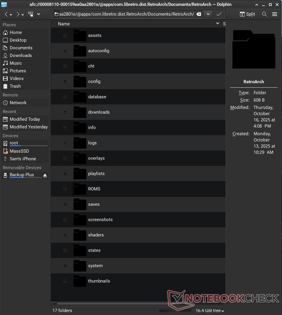 Cuando intenté instalar KDE (leer más arriba), dejó el gestor de archivos Dolphin en mi dispositivo. Empecé a utilizar Dolphin y lo preferí al gestor de archivos predeterminado de XFCE4 (Thunar). Dolphin guardaba una agradable sorpresa: podía detectar mi iPhone cuando estaba enchufado. Esto hizo que fuera facilísimo transferir archivos desde y hacia mi teléfono, ya que el gestor de archivos concedía acceso total a los archivos del iPhone. Debido a lo lejos que ha llegado la gestión de archivos de Apple en iOS, había archivos específicos para cada una de mis aplicaciones. El proceso en general es significativamente más fácil de lo que era en Windows, ya que iTunes ya no es necesario.