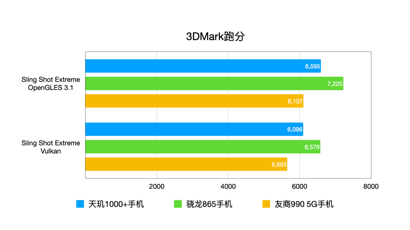 (MediaTek Dimensity 1000+ - blue; Qualcomm Snapdragon 865 - green; HiSilicon Kirin 990 5G - yellow)