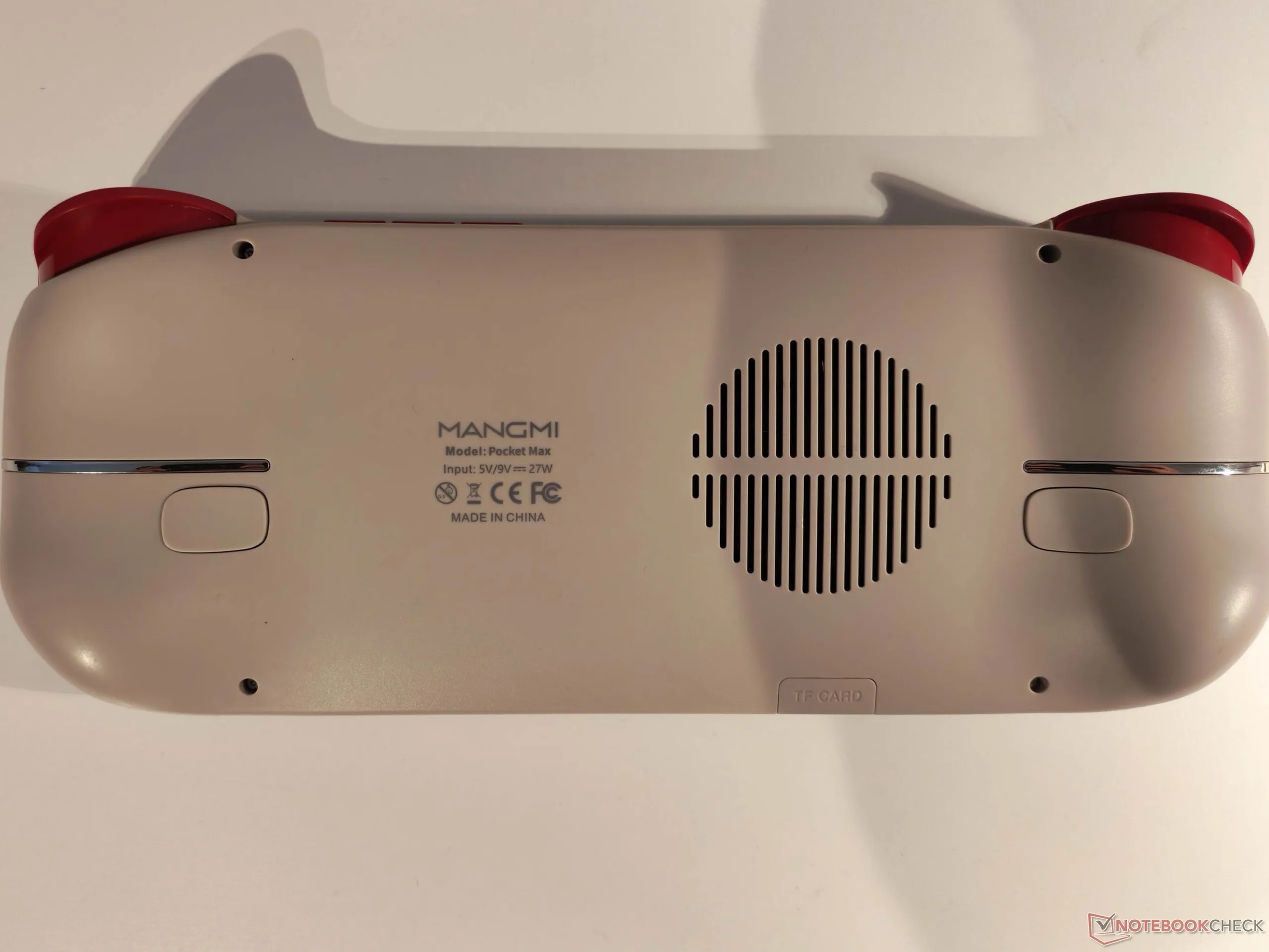 El Mangmi Pocket Max viene con una pantalla de siete pulgadas y, por lo tanto, definitivamente ya no es un dispositivo portátil (retro) muy compacto. Toda la parte frontal está a una misma altura y tiene un panel de cristal. La parte trasera tiene forma ergonómica, por lo que hay cuernos moldeados a izquierda y derecha, que también albergan los motores de vibración. También se puede ver una rejilla de ventilación, y hay otra rejilla en la parte superior.
