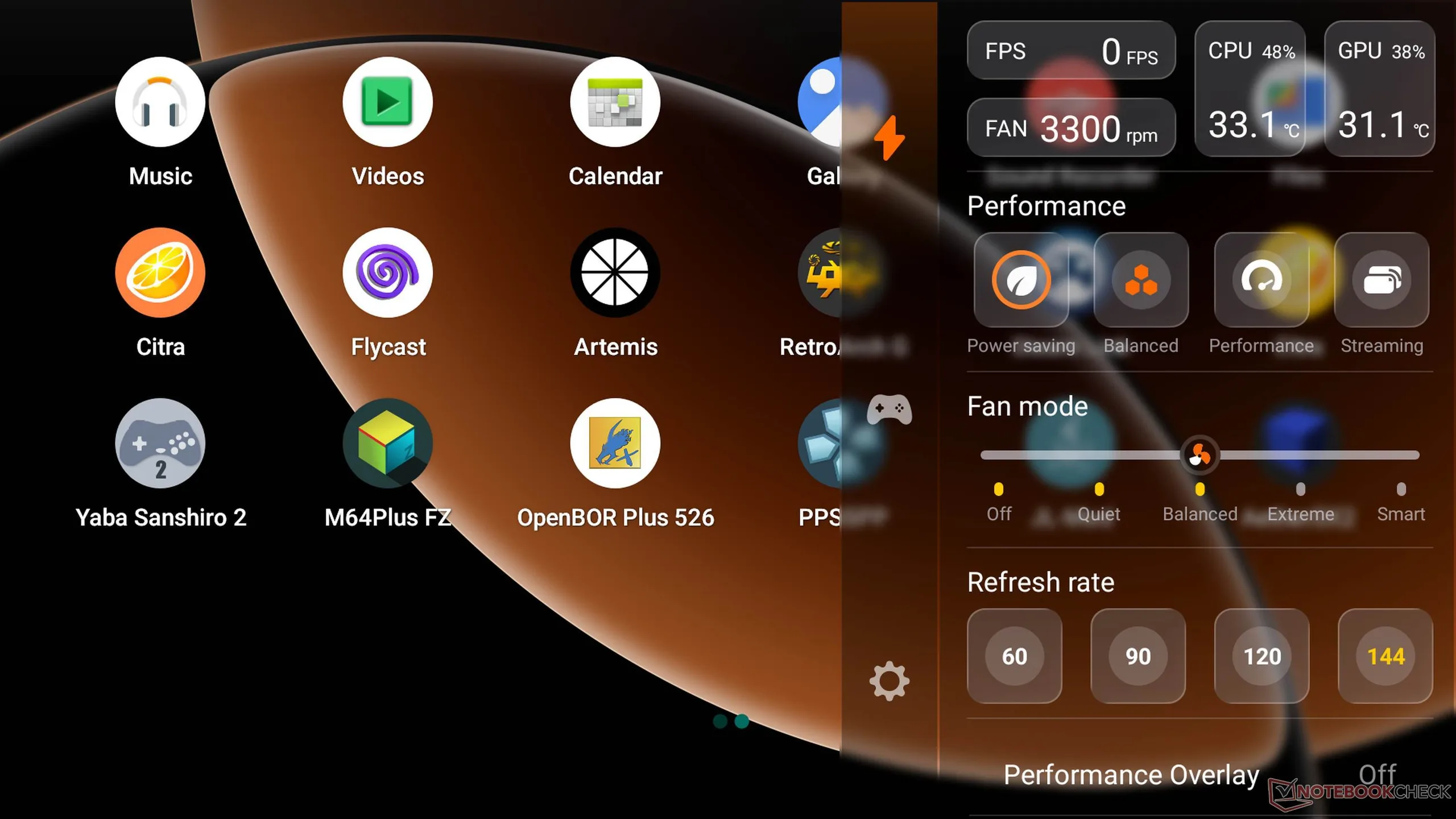El Mangmi Pocket Max se basa en Android 13, por lo que es fácil de configurar. Durante la instalación inicial se pueden seleccionar varios emuladores, que están disponibles de inmediato. En la barra lateral hay integrada una barra de acceso rápido muy útil, que muestra la carga actual, permite seleccionar varios modos de rendimiento, modos de ventilador y la frecuencia de actualización y también proporciona un acceso rápido a las opciones de funcionamiento.