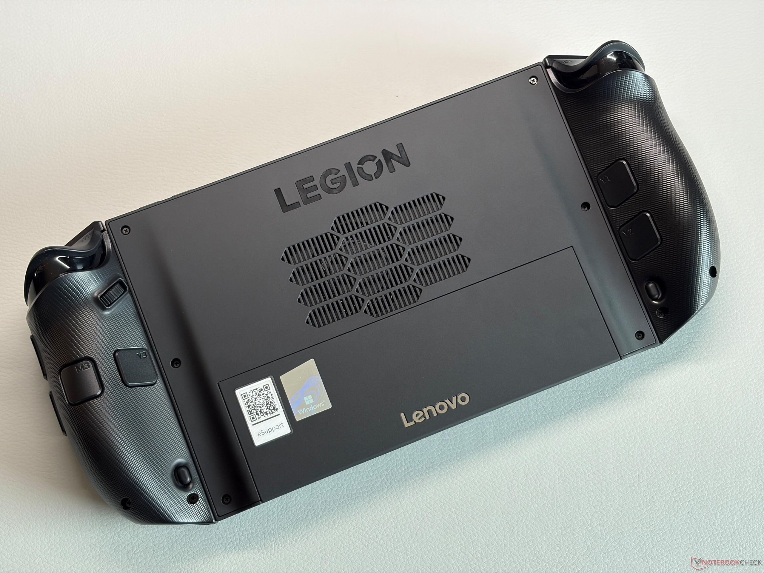 El diseño general de la Legion Go 2 se mantiene en la línea de su predecesora. El chasis de plástico negro es en gran parte liso y da la sensación de ser de alta calidad, con superficies texturizadas sólo en la parte trasera de los dos agarres para mejorar el manejo. Las empuñaduras siguen siendo desmontables, lo que permite colocar la unidad central con la pantalla y el hardware interno sobre una mesa, por ejemplo. El pie de apoyo integrado sigue siendo relativamente delgado, pero ya no es tan fácil de doblar como en el modelo anterior.