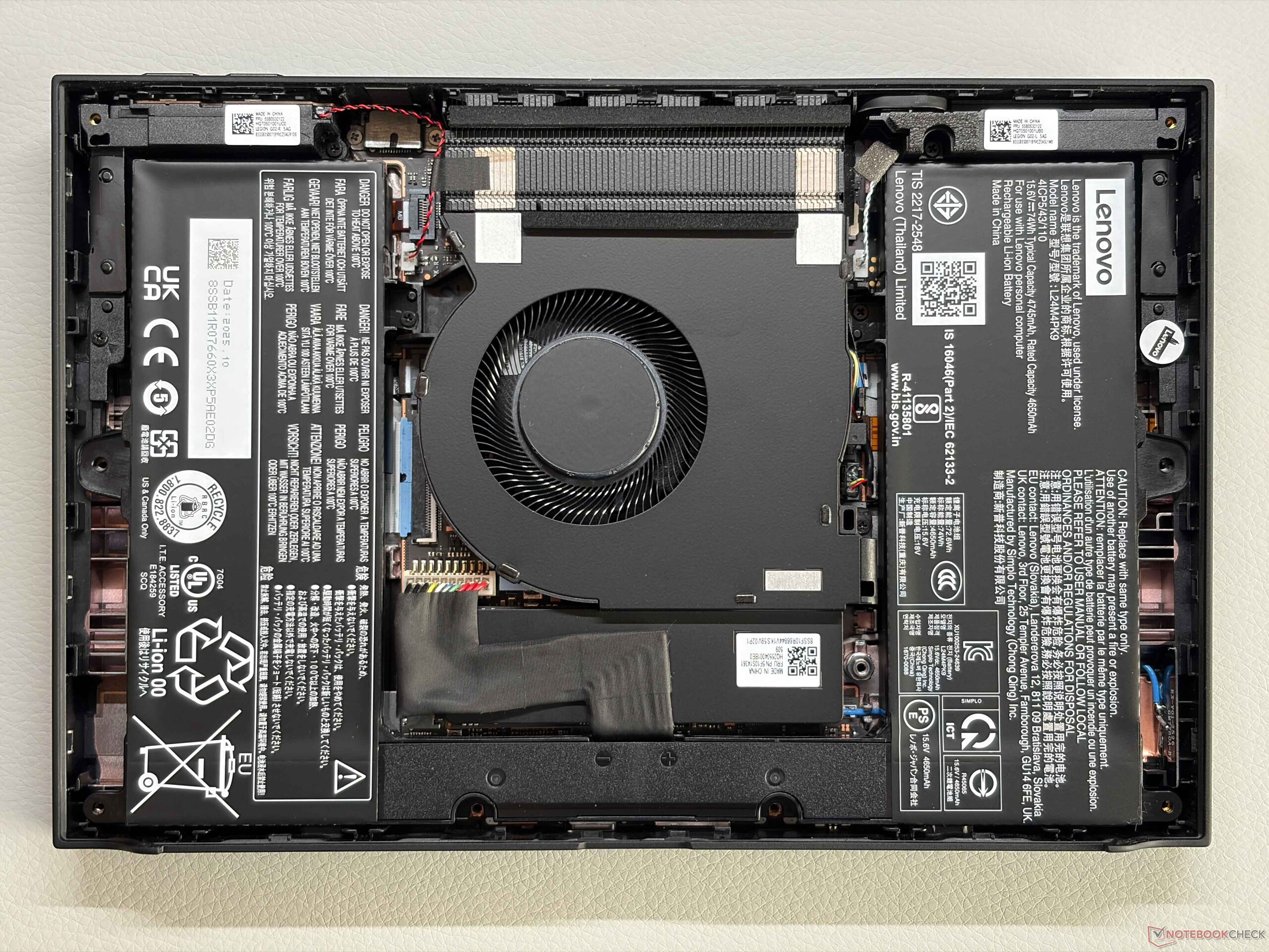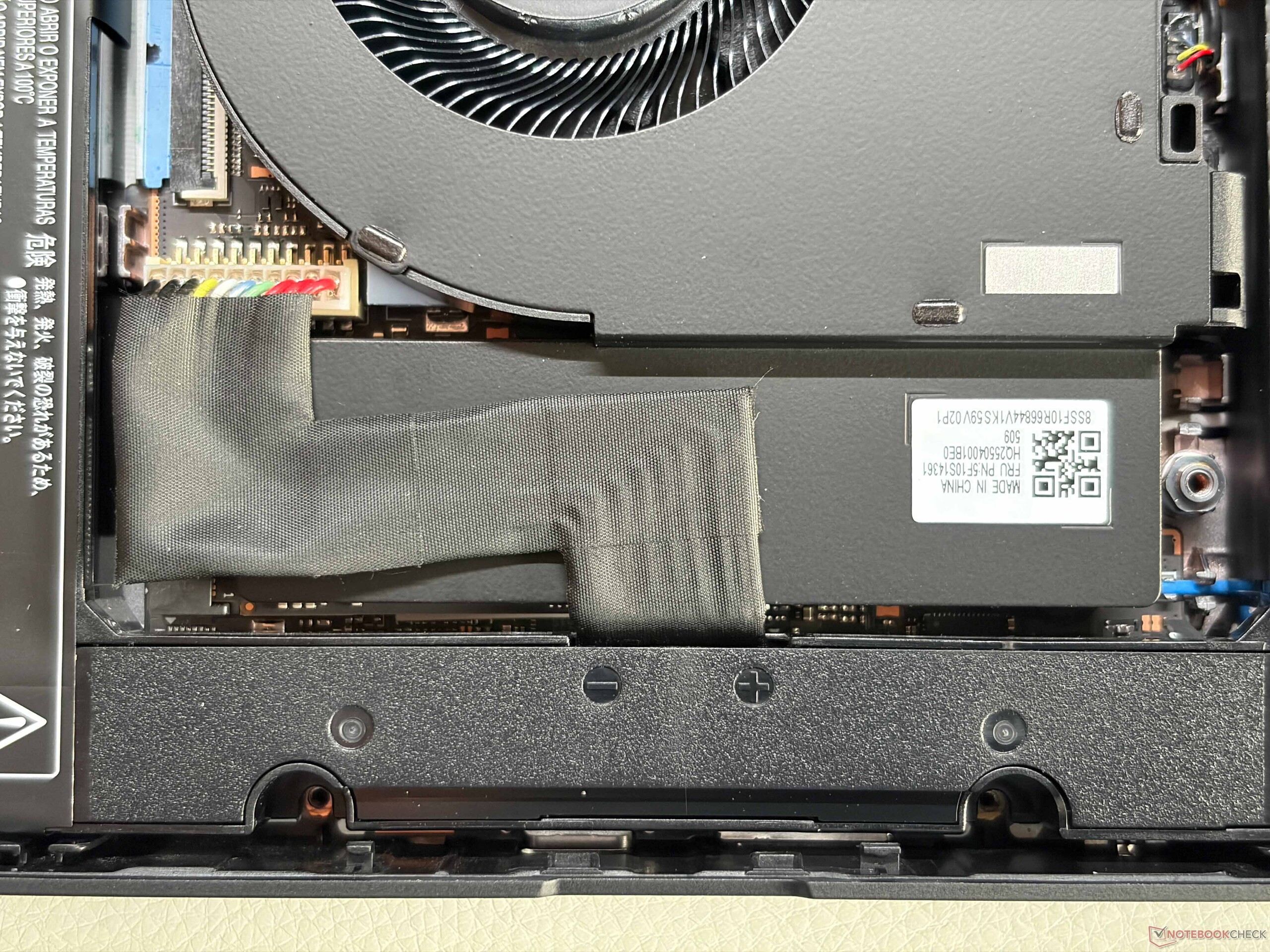 Internamente, la disposición también se ha rediseñado. Las baterías se sitúan ahora a ambos lados, con un único ventilador situado en el centro. La unidad SSD M.2 2280 se encuentra debajo y puede sustituirse, aunque primero hay que desconectar un cable de conexión. A pesar de su elevado precio, el dispositivo sigue sin ser compatible con Wi-Fi 7.