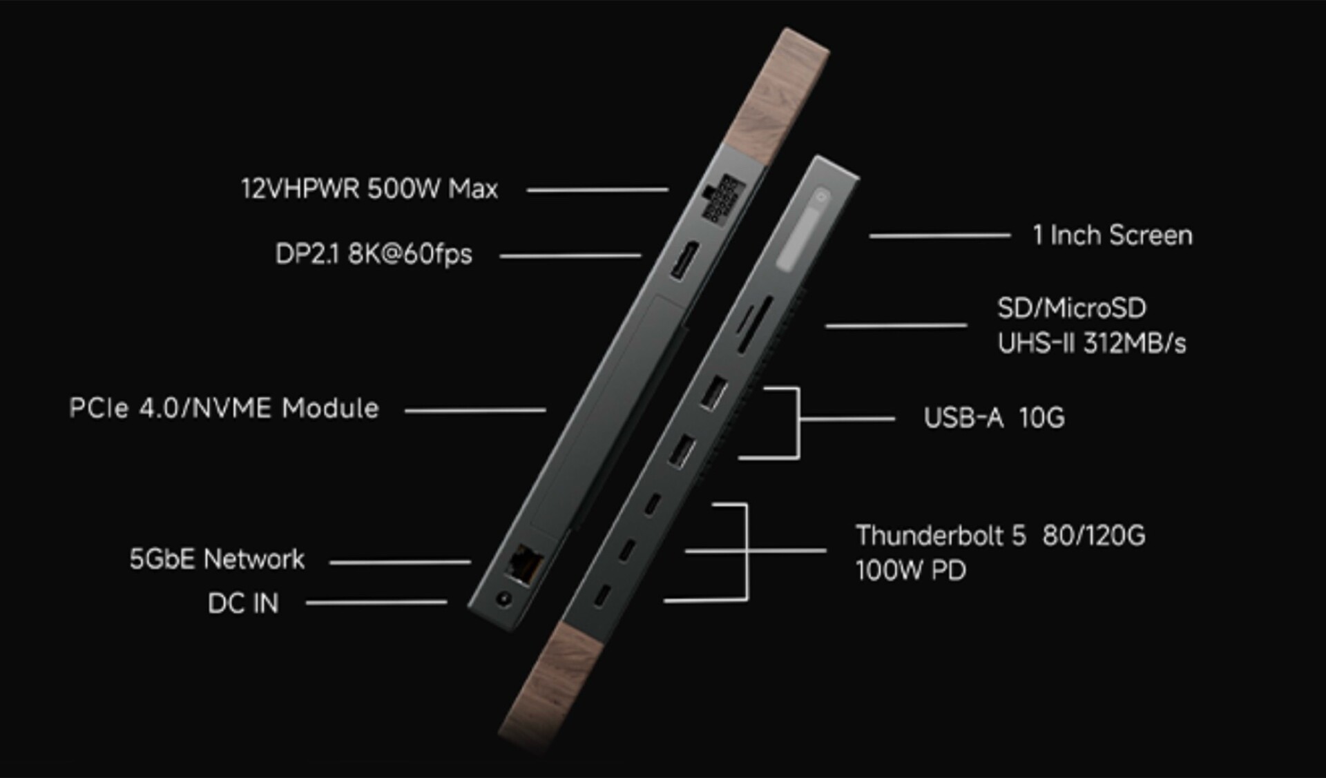 Los portátiles conectados pueden cargarse a una potencia de hasta 100 vatios, mientras que una pantalla de 1 pulgada muestra el estado actual de la base. Podría decirse que la característica más inusual es la ranura PCIe oculta bajo la cubierta de la parte superior, que permite al usuario conectar una GPU de sobremesa normal junto con una fuente de alimentación de 500 vatios. La tarjeta gráfica se conecta a través de PCIe 4.0 x4.