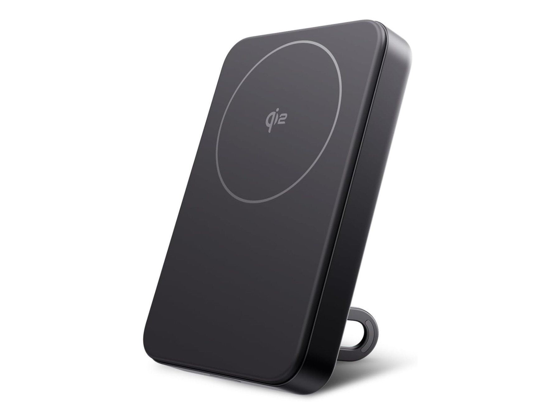 La batería magnética Rapid Mag Qi2 (10.000 mAh, 15 W) también incluye un práctico soporte que puede colocar el teléfono en posición vertical u horizontal para facilitar la visualización con las manos libres. A diferencia de su hermano más caro, no cuenta con una pantalla integrada; en su lugar, dispone de cuatro LED que muestran la capacidad restante de la batería. Tampoco le pesará cuando esté fuera de casa, ya que pesa 220 g (7,76 oz) y tiene un grosor de 15,95 mm.