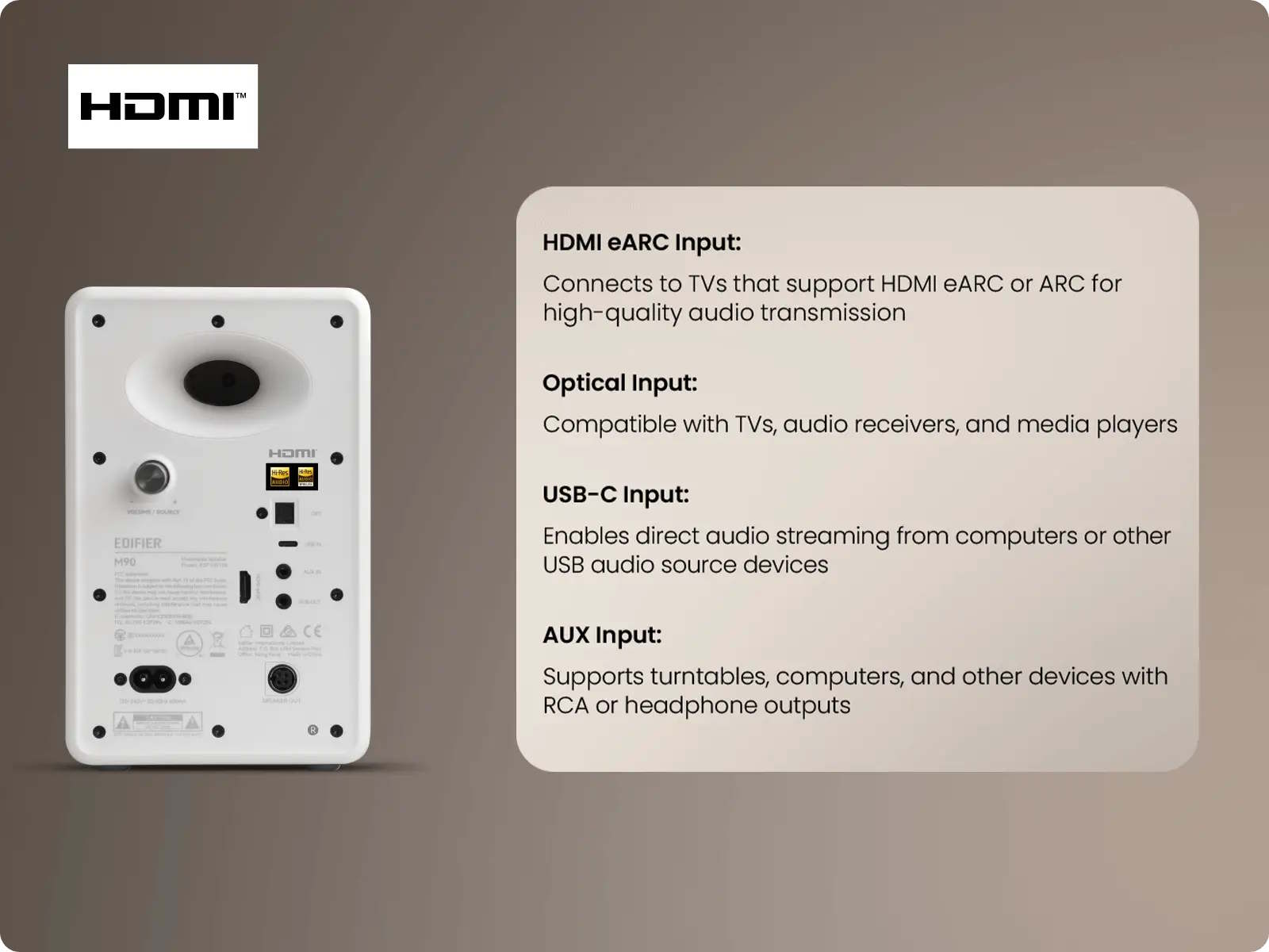 Edifier, empresa conocida por sus sistemas de audio, ha lanzado recientemente los altavoces activos M90. Gracias a su diseño activo, sólo necesitan una fuente de alimentación y una señal de audio, sin necesidad de amplificador externo. Ofrecen una amplia gama de opciones de entrada, incluyendo LDAC sobre Bluetooth para audio inalámbrico de alta resolución. También admiten HDMI eARC; esta característica no siempre se encuentra en esta clase de altavoces y agiliza significativamente el proceso de conexión del M90 a un televisor. Las opciones de entrada adicionales incluyen audio óptico, AUX y USB-C. El sistema también proporciona una salida de subwoofer, lo que resulta útil dada la ausencia de un subwoofer integrado.