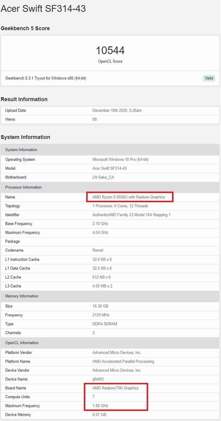 El resultado del Geekbench del Acer Swift SF314-43 revela que la iGPU del Ryzen 5 5500U tiene siete unidades de cálculo y una velocidad de reloj máxima de 1,80 GHz. Esto supone un práctico aumento del 20% de la velocidad de reloj con respecto al componente de procesamiento gráfico del Ryzen 5 4500Uy debería significar que los futuros propietarios de este portátil Acer Swift deberían poder disfrutar de algunas sesiones de juego ligeras cuando no utilicen la parte de la CPU del chip Zen 2 para la multitarea relacionada con el trabajo o el estudio. Las APU móviles Ryzen 5000 de AMD están empezando a parecer que podrían ser un éxito tan grande como lo fueron los chips de la serie Renoir Ryzen 4000