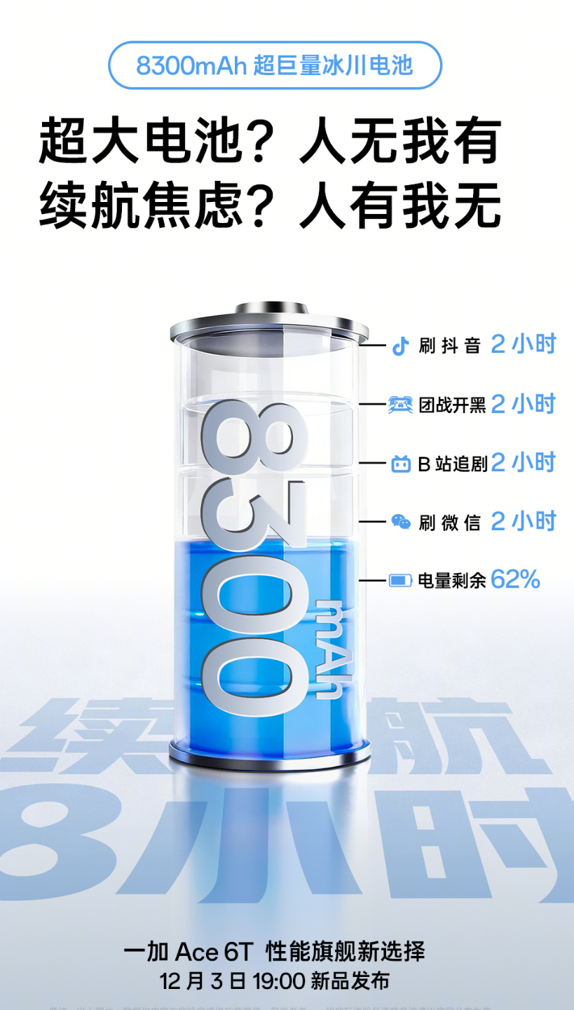 Ahora, la compañía ha confirmado que el Ace 6T contará con la batería más grande de todos los smartphones que ha lanzado hasta ahora. Para recapitular, el Ace 6 reclamó esa corona el mes pasado con una capacidad de 7.800 mAh, lo que supone un aumento de 500 mAh respecto al OnePlus 15. En una nueva serie de teasers, OnePlus ha revelado que el Ace 6T llevará la misma ventaja sobre el Ace 6 gracias a una batería de 8.300 mAh que admite carga por cable de 100 W.