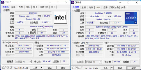 El Core i9-13900 ES1 muestra ocho núcleos de rendimiento (P-cores) y 16 núcleos de eficiencia (E-cores). Los núcleos P pasan ahora a la nueva arquitectura Raptor Cove, mientras que los núcleos E siguen basándose en Gracemont. El Core i9-13900 también cuenta con 36 MB de caché, 6 MB más que el Alder Lake Core i9-12900K.