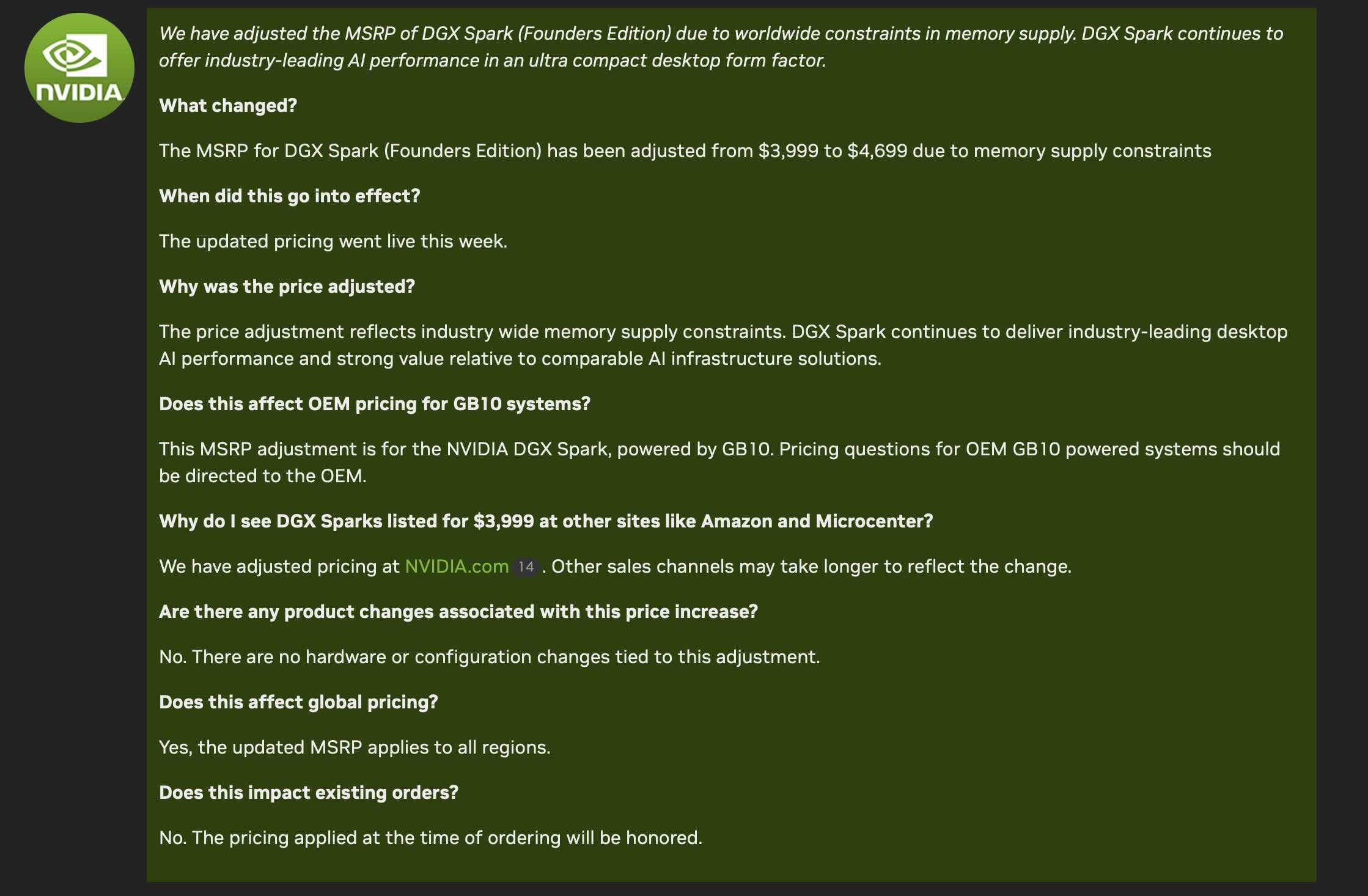 Evidentemente, el mini PC para estaciones de trabajo dista mucho de ser un sistema asequible, y se lanzó con un PVPR de 3.999 dólares. En un reciente comunicado, sin embargo, la compañía ha revelado que el precio del sistema aumentará en 700 dólares, elevando su MSRP a 4.699 dólares. Nvidia atribuye el aumento masivo a los costes desorbitados de la DRAM y el almacenamiento, lo que no es ninguna sorpresa.