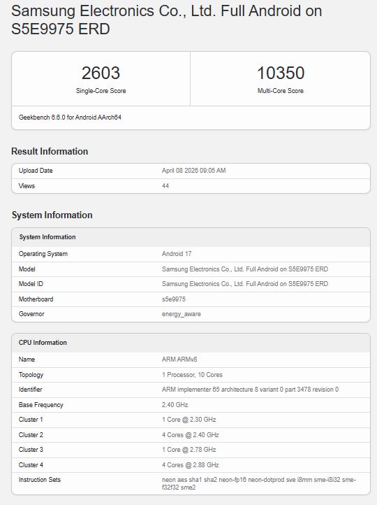 El listado muestra el chipset con una configuración de deca núcleos como el Exynos 2600, pero en cuatro grupos de núcleos: un núcleo a 2,30 GHz, cuatro núcleos a 2,40 GHz, un núcleo a 2,78 GHz y cuatro núcleos más a 2,88 GHz. En comparación, el núcleo principal del Exynos 2600 funciona a 3,80 GHz, con tres núcleos extra de rendimiento a 3,25 GHz. Eso significa efectivamente que el chipset de nueva generación aún tiene mucho rendimiento que dar, y será interesante ver cómo mejoran sus cifras de referencia de CPU en el transcurso del próximo año a medida que se acerque al producto final.