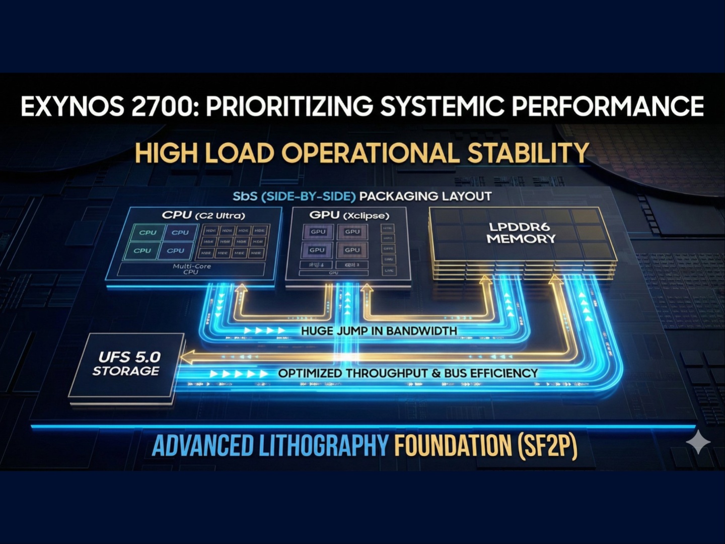 En cuanto a las puntuaciones estimadas en Geekbench, se dice que el Exynos 2700 obtiene una puntuación un 40% superior en rendimiento mononúcleo y un 30% superior en multinúcleo en comparación con el Exynos 2600. También utiliza un Heat Path Block (HPB) de cobre unificado en un diseño de empaquetado FOWLP-SbS (Side-by-Side), una mejora respecto a la iteración de primera generación para el Exynos 2600. Esto coloca la DRAM junto al troquel con el disipador de calor (HPB) cubriendo ambos componentes. Junto con la CPU, la GPU Xclipse de nueva generación también recibirá una actualización con transferencias de datos entre un 80% y un 100% más rápidas desde la RAM LPDDR6 y el almacenamiento UFS 5.0, lo que se traducirá en un aumento del rendimiento de hasta el 40%.
