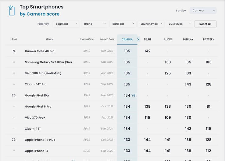 Por lo tanto, no es de extrañar que el Pixel 10a solo haya conseguido 134 puntos en el análisis de la cámara de DxOMark análisis de la cámara - seis puntos más que el Pixel 9a, lo que puede atribuirse a las mejoras en el procesamiento de imágenes. Esto es justo lo suficiente para el puesto 75 en las tablas de cámaras de DxOMark. Con 136 puntos, incluso el Pixel 8a obtiene mejores resultados, ya que hace dos años Google instaló una cámara principal de 64 MP con un sensor más grande de 1/1,73 pulgadas. El mucho más antiguo Apple iPhone 15 está muy por delante del Pixel 10a con 145 puntos