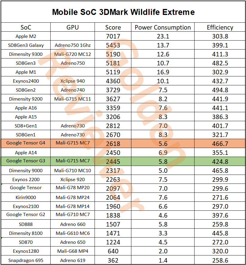 Google Tensor G4 performance/power consumption/efficiency test results.