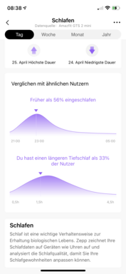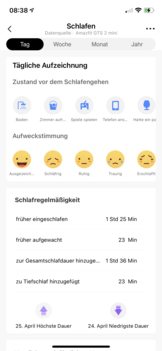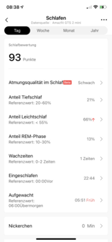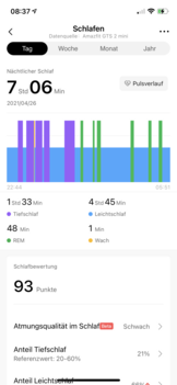 El Amazfit GTS 2e registra la hora a la que el usuario se duerme y se despierta y analiza las fases del sueño. Si se compara el registro de la misma noche con el del Amazfit GTS 2 mini, aquí también hay diferencias a pesar de que ambos dispositivos utilizan la misma configuración para la intensidad de la medición del pulso. Incluso después de cambiar las correas entre la muñeca izquierda y la derecha, parece que el Amazfit GTS 2e realiza un seguimiento del sueño más preciso que el Amazfit GTS 2 mini.