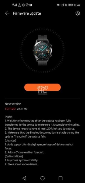 Según el registro de cambios oficial, la v1.0.11.20 trae un pronóstico del tiempo de 7 días al WatchGT 2, junto con soporte para mostrar más tipos de datos sobre las caras de los relojes. Sin embargo, Huawei no ha especificado qué datos pueden ser mostrados ahora. El registro de cambios establece que la v1.0.11.20 mejora la estabilidad del sistema y arregla algunos problemas conocidos, pero sí establece cómo o qué problemas aborda la actualización.