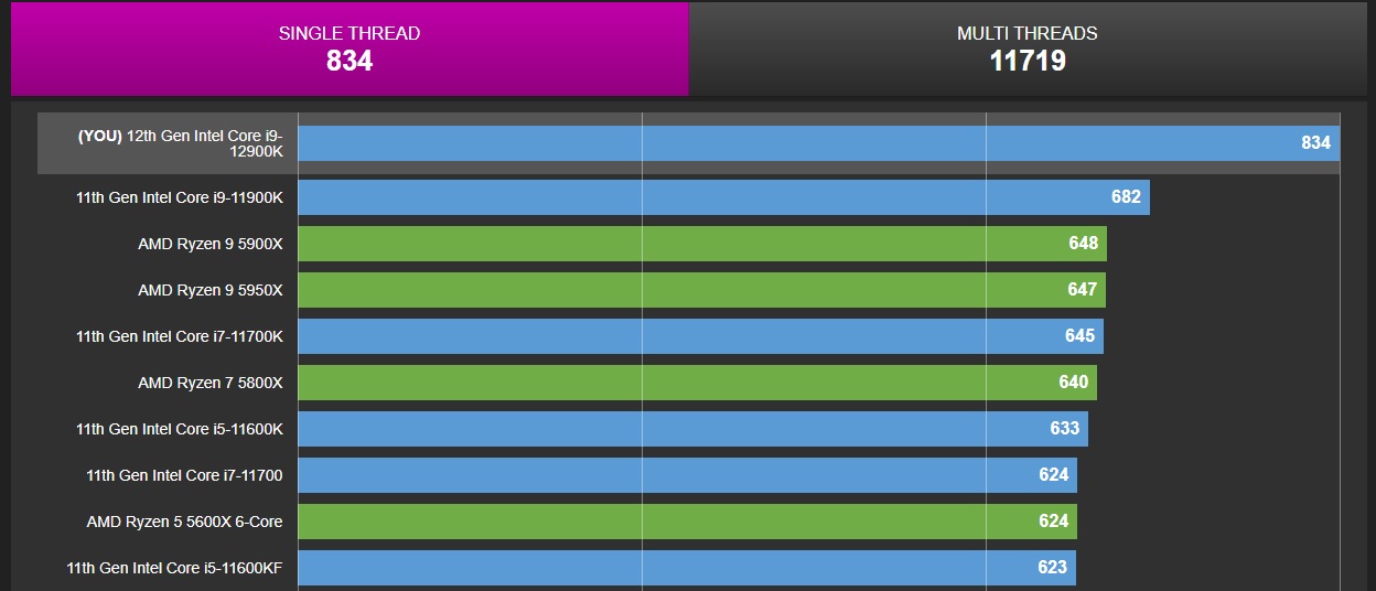 Por supuesto, hay ejemplos de Ryzen 9 5900X e i9-11900K logrando resultados más altos que los mostrados en la tabla de CPU-Z, pero así es como se ven las cosas por el momento: El i9-12900K consiguió 813 puntos y 834 puntos. Utilizando una media de 823,5 puntos, esto dejaría a la pieza Alder Lake con estas increíbles diferencias de rendimiento +20,75% sobre el i9-11900K, +27,08% sobre el Ryzen 9 5900X, y +27,28% sobre el Ryzen 9 5950X. Los resultados de los multihilos también son fuertes, con el procesador 8C+8c/24T anotando 11,244 puntos y 11.719 puntos en los dos benchmarks, muy por encima de cualquiera de los otros chips del selecto grupo de CPUs que utilizan 24 hilos (Ryzen 9 5900X @9.544 puntos)