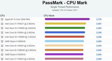 Así que ignorar las filtraciones inverosímiles nos ha dejado con pocos datos sobre el chip M1X, con Apple realizando un trabajo superlativo en la salvaguarda de sus secretos. Pero dado que el antiguo silicio M1 sigue encabezando las listas de rendimiento de un solo hilo en PassMark tanto en portátiles como en ordenadores de sobremesa, podemos suponer que el M1X debería relevar a su predecesor en esa posición concreta. El Apple M1 (8 núcleos, 8 hilos, reloj de 3,2 GHz, TDP de 15 W) llegó a la cima de estas tablas, más allá del alcance del Intel Core i9-11900KF y el AMD Ryzen 9 5950Xen abril Abril de este año. En aquel momento, el procesador ARM tenía una puntuación media de 3.630 puntos - y esa cifra es ahora de 3.779 puntos ya que las pruebas adicionales han aumentado https://www.cpubenchmark.net/singleThread.html su ventaja sobre el i9-11900KF (de sobremesa) y el i7-1195G7 (portátil).