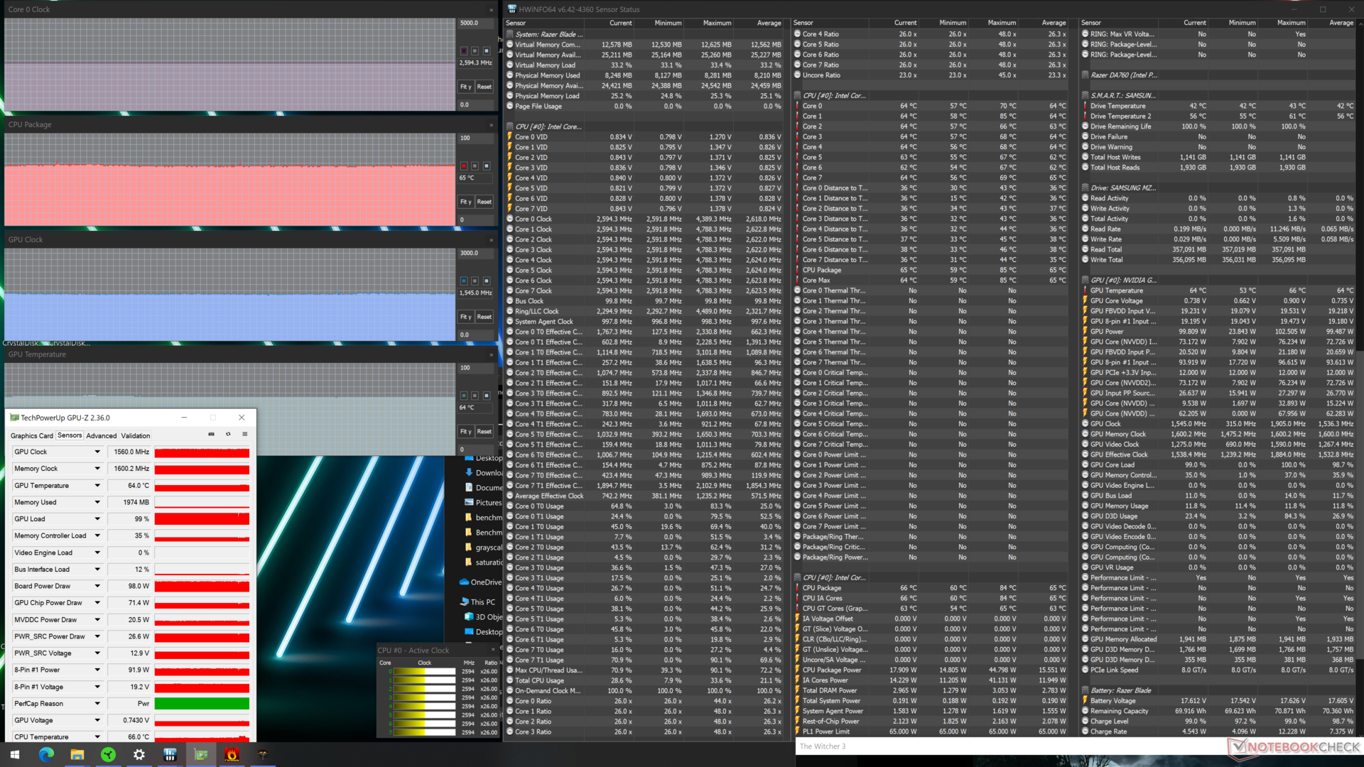 Las principales desventajas del Maingear, más ligero, son sus mayores temperaturas del núcleo cuando se juega, ya que su solución de refrigeración no es tan potente como la del Razer. Las temperaturas de la CPU y la GPU se estabilizarían en 80 C cada una cuando se ejecuta Witcher 3 en comparación con los 65 C del Razer, como se puede ver en las capturas de pantalla. Por lo tanto, los usuarios estarían sacrificando la rigidez del chasis y las temperaturas más bajas del núcleo si prefieren el modelo Maingear, más ligero y fácil de transportar.