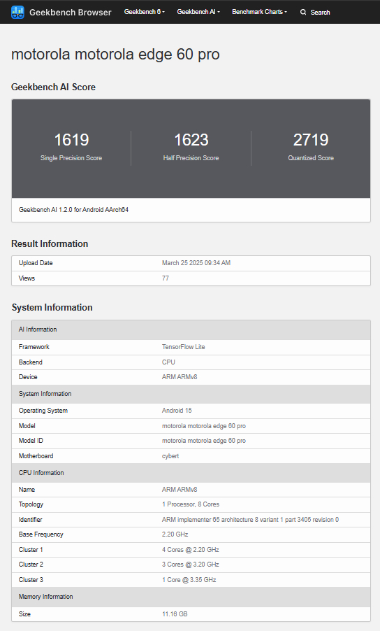 En cualquier caso, los diseños frontal y trasero mostrados coinciden con las imágenes promocionales del Edge 60 Pro que aparecieron en Internet el mes pasado. Si un reciente listado de Geekbench en https://browser.geekbench.com/search?k=ai&q=motorola+motorola+edge+60+pro motorola complementará la pantalla curvada y las tres cámaras traseras del Edge 60 Pro con un procesador Dimensity 8350 y 12 GB de RAM. Según nuestros puntos de referenciael cambio al chipset de 4 nm de MediaTek ofrecerá aproximadamente una mejora del 20% en el rendimiento de la CPU con respecto al Snapdragon 7 Gen 3 Que Motorola utiliza en el Edge 50 Pro. En otras palabras, el Edge 60 Pro debería ser casi tan potente como el Poco X6 Pro y Xiaomi 14T que revisamos el año pasado.