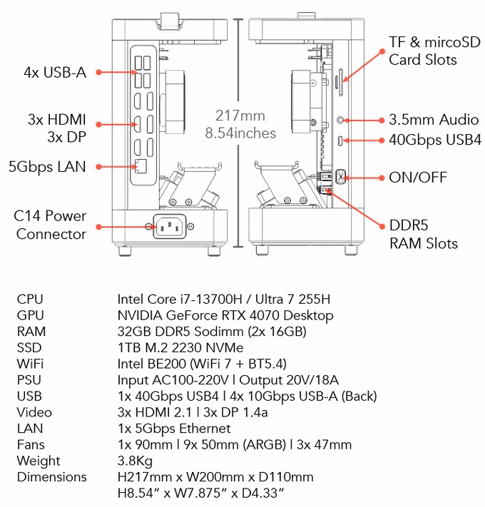 La campaña de Kickstarter ya ha alcanzado los objetivos de financiación y el equipo chino ofrece ahora dos modelos gracias a que se han alcanzado sus stretch goals. Wee Beastie Core es el modelo de 699 dólares que integra una GPU RTX 4070 MXM y un Intel Core i7-13700H mientras que el Wee Beastie PRO incorpora un procesador más reciente Intel Core Ultra 7 255H más reciente. Ambos modelos vienen con una fuente de alimentación de 400 W, iluminación RGB en los ventiladores, 32 GB de RAM y 1 TB de SSD por defecto y admiten hasta 16 TB de almacenamiento y 128 GB de RAM. El equipo chino está esencialmente probando la demanda por ahora, ya que los modelos Core estarán limitados a 200 unidades y los PRO a 300.