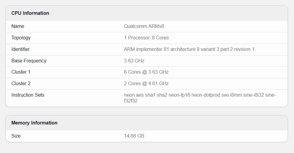 El POCO F8 Ultra apareció en la base de datos Geekbench 6, acumulando puntuaciones de 3.327 en las pruebas de un solo núcleo y 9.872 en las de varios núcleos. Ahondando en los detalles, el nombre en clave de la placa base, "canoa", y las velocidades de reloj de la CPU (4,61GHz para los dos núcleos principales y 3,63GHz para los seis restantes) confirman que el dispositivo contará con el potente Chip Snapdragon 8 Elite Gen 5.