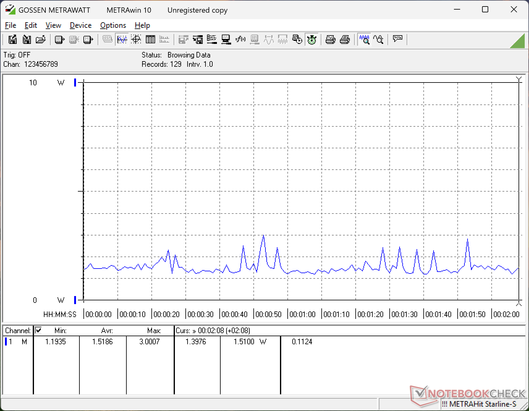 El gráfico siguiente muestra el consumo de energía de la configuración XPS 16 FHD+ durante un periodo de dos minutos en reposo en el escritorio con el ajuste de brillo más bajo y con VRR activado. El sistema consumiría una media de sólo 1,5 W, lo que es muy impresionante para una pantalla grande de 16 pulgadas. Modelos de la competencia como el Asus ZenBook S16 o MSI Prestige 16 consumirían cada uno entre 3 W y 5 W en condiciones similares.
