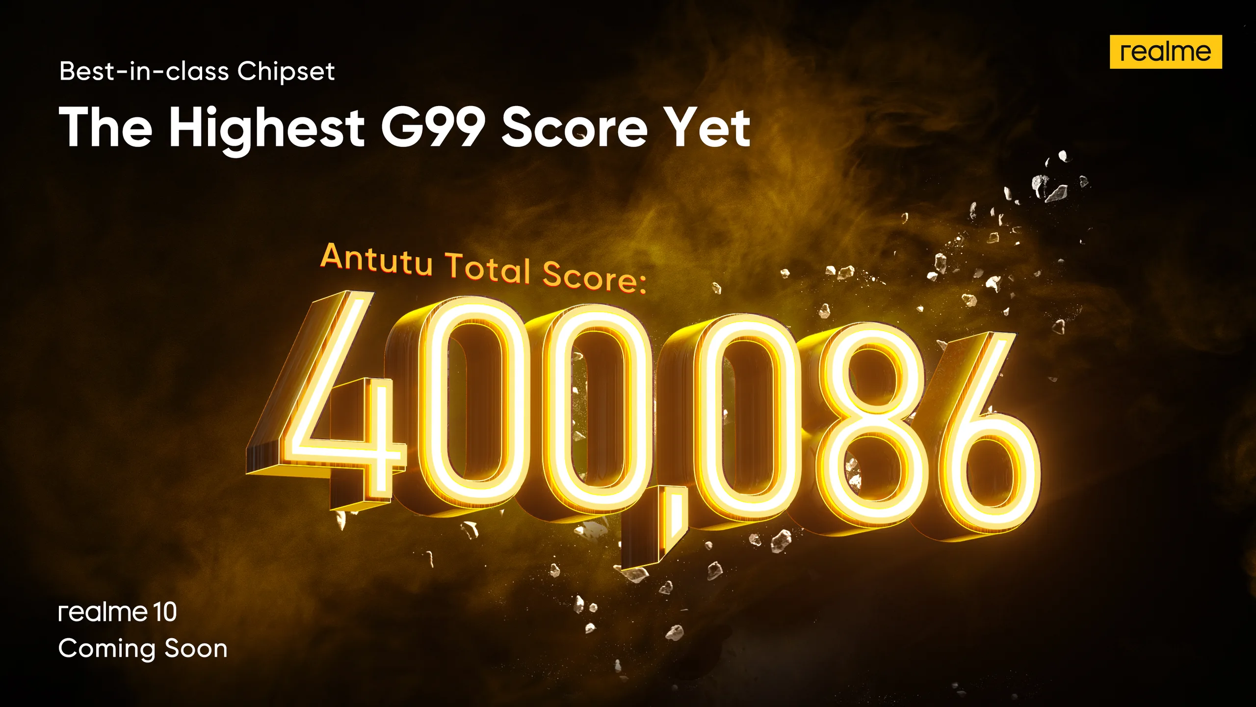 Realme también afirma haber estado en AnTuTu con el dispositivo antes de su lanzamiento, y haber establecido que el 10 4G era capaz de establecer la puntuación más alta para su SoC en este benchmark a partir del 28 de octubre de 2022. El smartphone de gama básica habría completado estas pruebas con un total de 400.098.