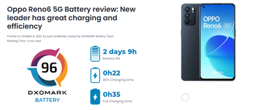 DxOMark citó el sistema patentado SuperVOOC 2.0 que permite al Reno6 cargar hasta con 65W para otorgar estas puntuaciones, así como la capacidad del teléfono de durar unas 10 horas con una carga de 5 minutos, incluso si su nivel de batería era del 50% o menos