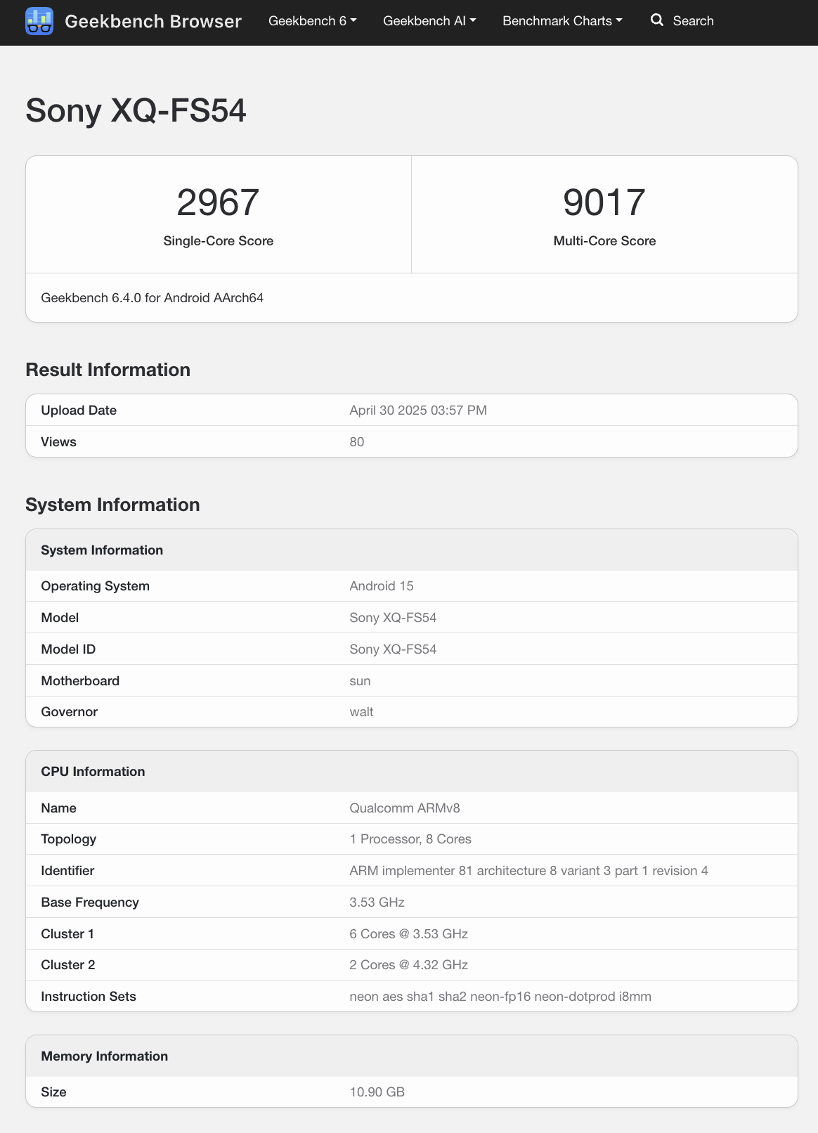 Ahora, el mismo dispositivo parece haber realizado su primer viaje a través de los puntos de referencia mononúcleo y multinúcleo de Geekbench. Con el número de modelo XQ-FS54, el dispositivo ejecuta, como era de esperar, Android 15, que Sony ha estado incorporando a sus smartphones en los últimos meses. Además, el listado del punto de referencia parece confirmar la inclusión de un Qualcomm Snapdragon 8 Elite a juzgar por el identificador de la CPU y los clústeres mostrados.