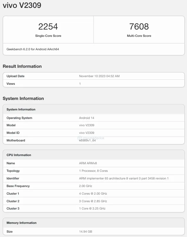 Ese rumor se basa en el descubrimiento de los mismos 2 nuevos números de modelo Vivo supuestamente visto en la Oficina de Estándares Indios (BIS) en Geekbench, ambos con el mismo procesador de hasta3.25GHz procesador y un Android 14-interfaz de usuario.