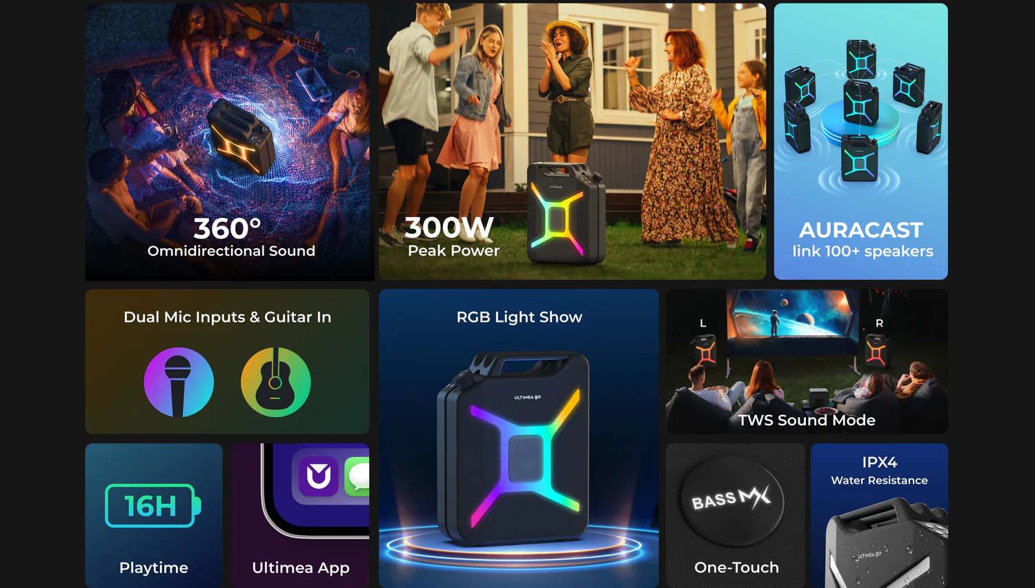 Ultimea ofrece el Go como altavoz inalámbrico. Su diseño sigue claramente el modelo de una lata de gas, aunque si eso resulta atractivo dependerá del gusto personal. Ultimea ha retomado incluso los contornos acanalados de una lata de gas. También cuentan con iluminación RGB, lo que permite acompañar visualmente la salida de audio. El Ultimea Go no es sólo un altavoz Bluetooth, ya que también permite conectar dos micrófonos con cable y una guitarra. Eso podría hacer que el modelo fuera útil para artistas callejeros y para improvisadas jam sessions. Es compatible con Bluetooth 5.4 para la conectividad inalámbrica y se incluye un puerto USB. Ultimea enumera la salida máxima en 300W, y el altavoz está equipado con dos woofers de 5 pulgadas, un tweeter de 1 pulgada, y dos controladores de rango completo de 3 pulgadas. También se dice que los graves se pueden potenciar.