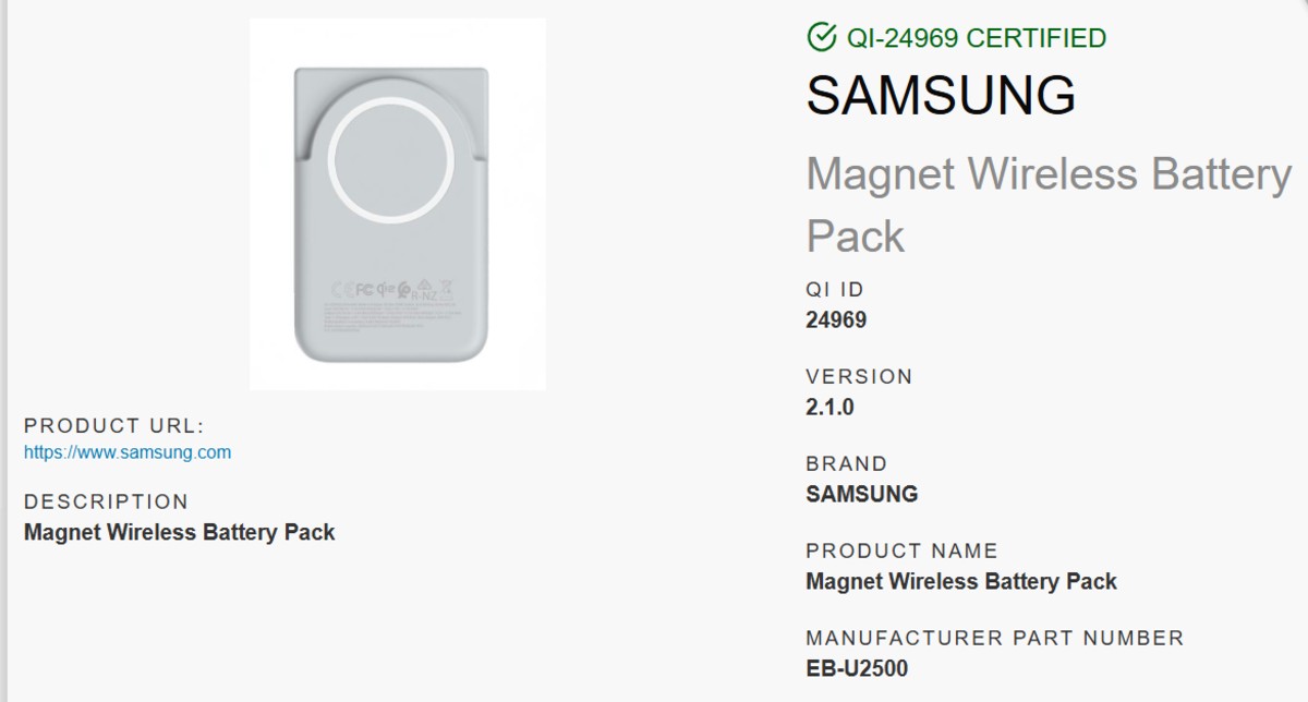 Añadiendo más peso a estos rumores, ha aparecido en la base de datos del Wireless Power Consortium un nuevo pack de batería inalámbrica magnética de Samsung con el número de modelo EB-U2500. Certificado para soportar la carga inalámbrica Qi2 de 15W, este será el primer banco de energía inalámbrico de Samsung con imanes incorporados. Este accesorio, que probablemente se lanzará junto con el Galaxy S26, se presenta en un acabado gris claro y cuenta con un anillo magnético, que debería permitir que se encaje en los smartphones compatibles para una carga inalámbrica sin problemas.