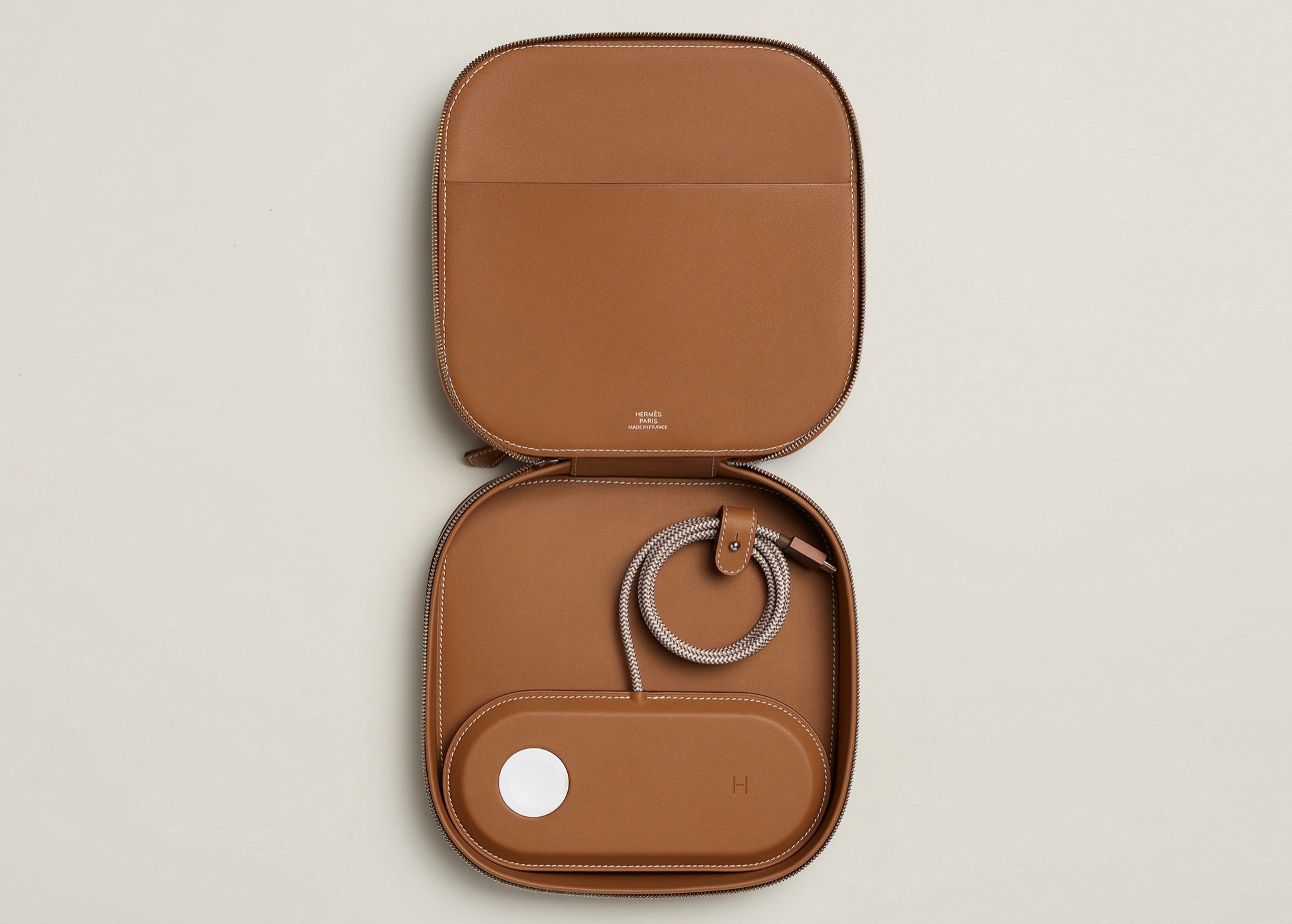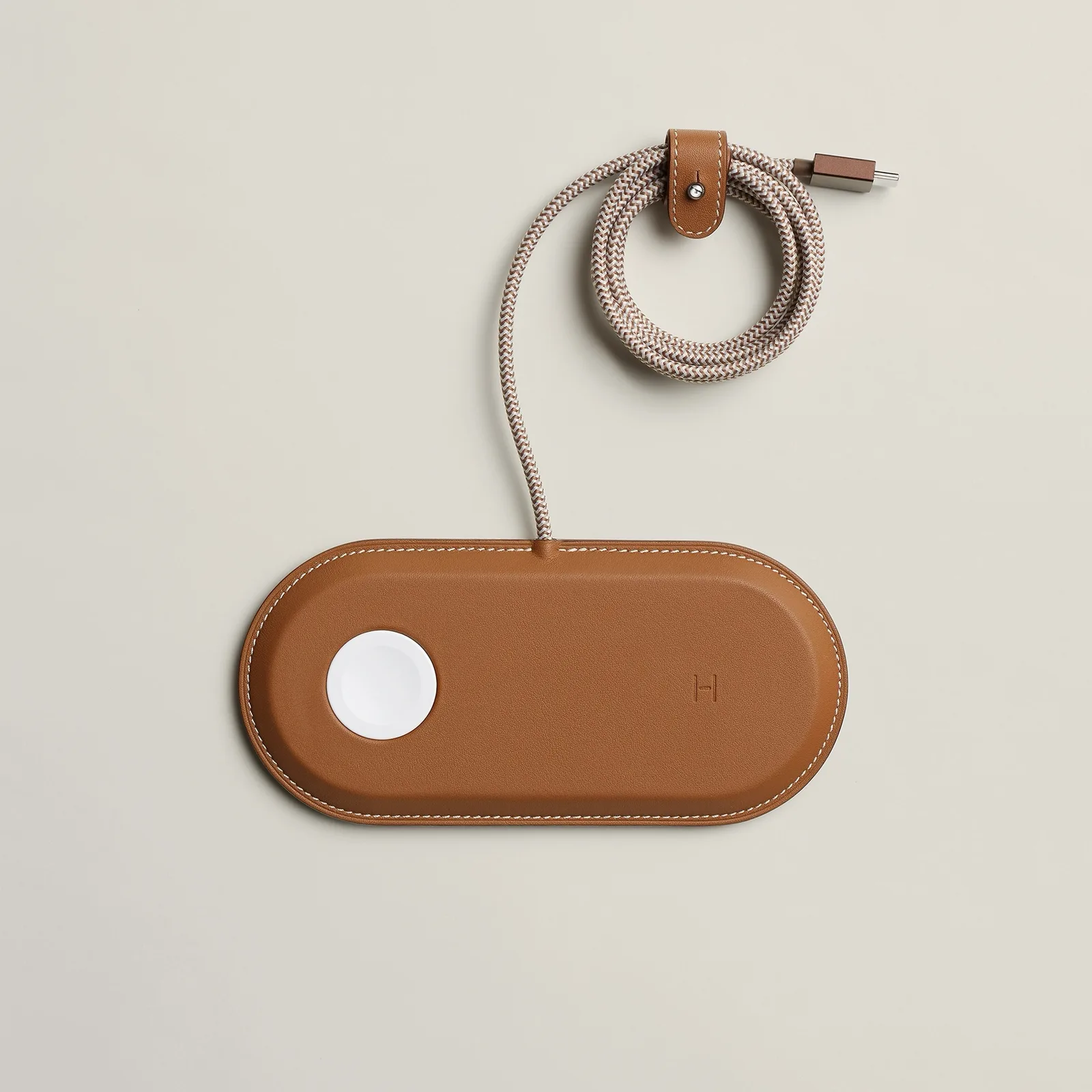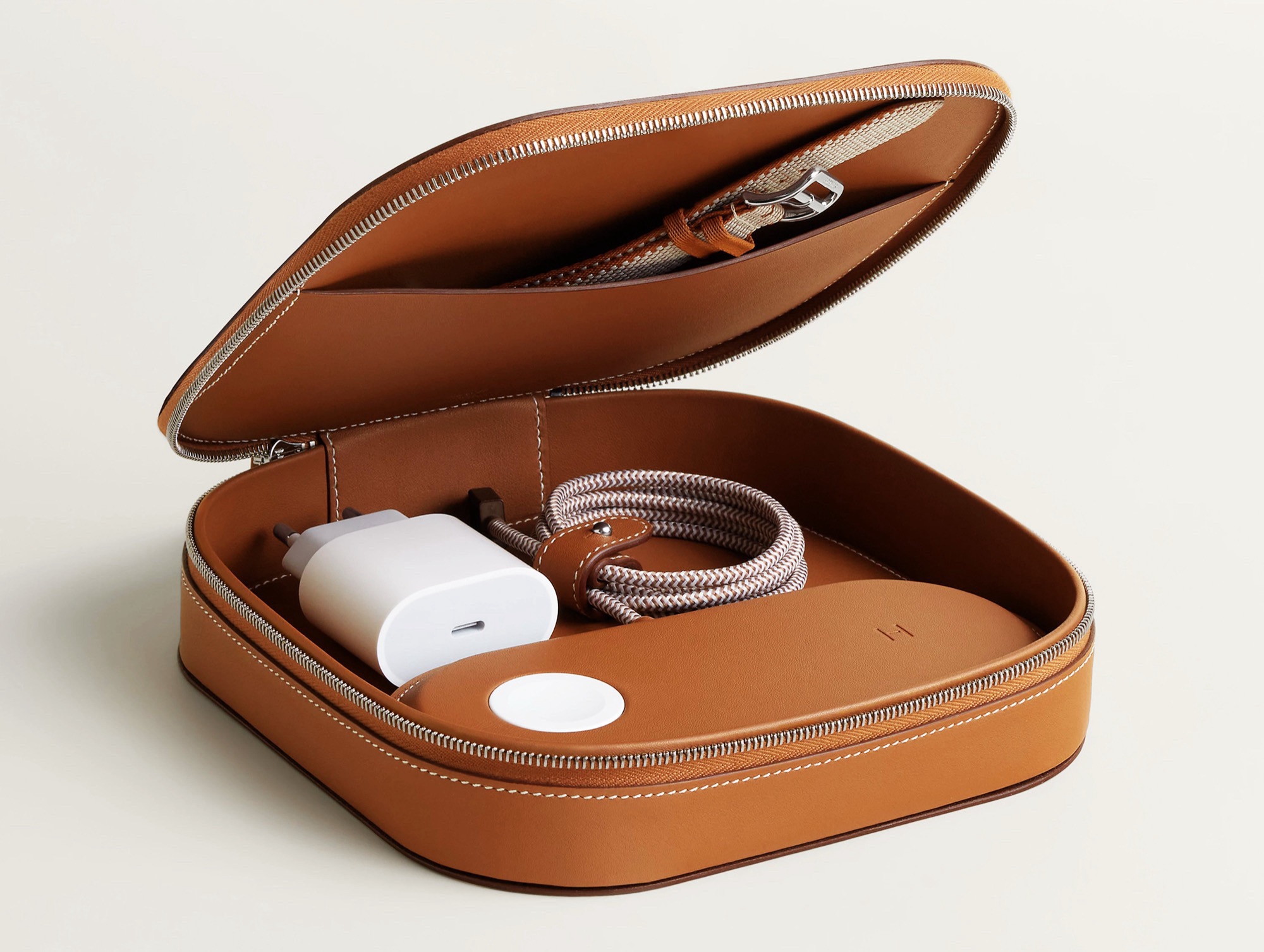 La pieza más destacada es un cargador MagSafe revestido íntegramente en cuero. La almohadilla de carga izquierda está diseñada para alojar un Apple Watch, mientras que la derecha ofrece una mayor potencia para cargar más rápidamente el iPhone. El cable está totalmente integrado, lo que significa que no puede sustituirse fácilmente si se estropea. El dispositivo tampoco se entrega con un adaptador USB-C y requiere uno capaz de suministrar al menos 20 vatios